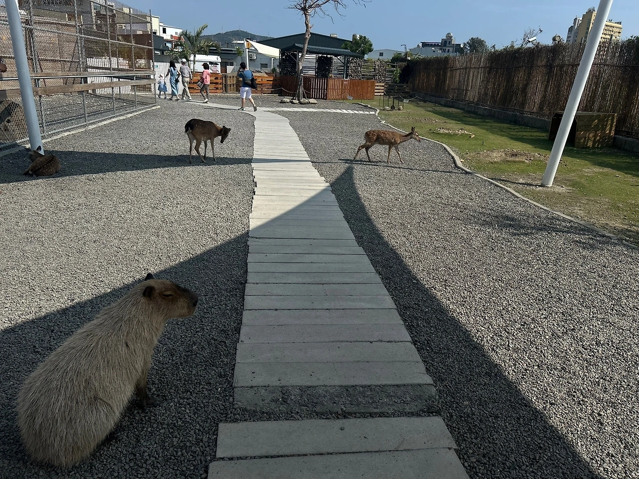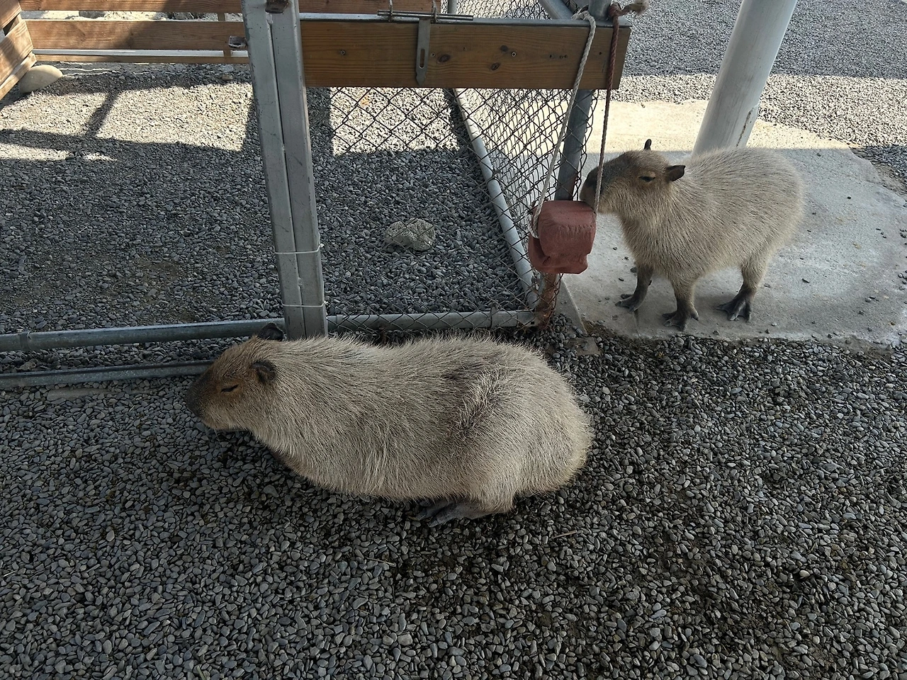 • 테마파크는 그리 넓지는 않다만, 카피바라를 비롯해서 꽃사슴과 염소를 같이 구경할 수 있고, 무엇보다 좁은 우리에 가둬놓은 것이 아니라서 직접 만져보고 먹이를 줄 수도 있었다. (먹이는 유료이다) 카피바라를 보는 것은 처음인데, 털을 만져보니 옛날 학교에서 쓰던 정말 까슬까슬한 빗자루 같았다. 카피바라, 염소, 사슴 모두 사람들을 엄청 좋아하는 것은 아니다만 그렇다고 사람에게서 도망치는 것은 아니라서, 많이 만져볼 수 있다는 것이 좋았다. 카피바라는 중국에서 한자로 수돈 (물돼지)라고 쓰던데 말 그대로 밖에서 놀다가 물에서 쉬는 녀석들도 많았다.