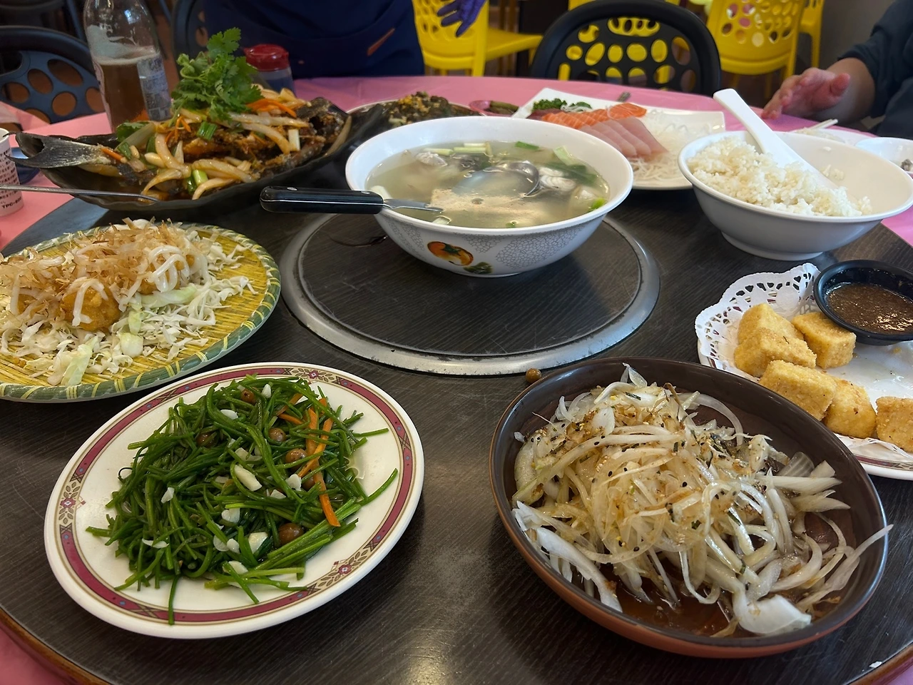 • 1시간 정도를 스노클링을 하고 다시 샵으로 돌아와 씻고 옷을 갈아입었다. 점심 먹을 곳을 추천해 달라고 했더니 정말 감사하게도 본인이 차를 끌고 어디인지 같이 알려주시겠다고 한다. 討海人 (투해인, 타오하이런) 이라는 이름의 식당이었다. 가게까지 가서 어떤 음식이 맛있는 지도 많이 추천해 주셔서, 어렵지 않게 점심도 주문할 수 있었다. 모둠사시미, 두부튀김, 크림새우, 어탕, 홍소생선 등등 푸짐한 한 상을 인당 2만 원 정도로 맛있게 먹을 수 있었다. 단체 여행을 하면 여러 음식을 같이 먹을 수 있다는 점이 좋은 것 같다.
