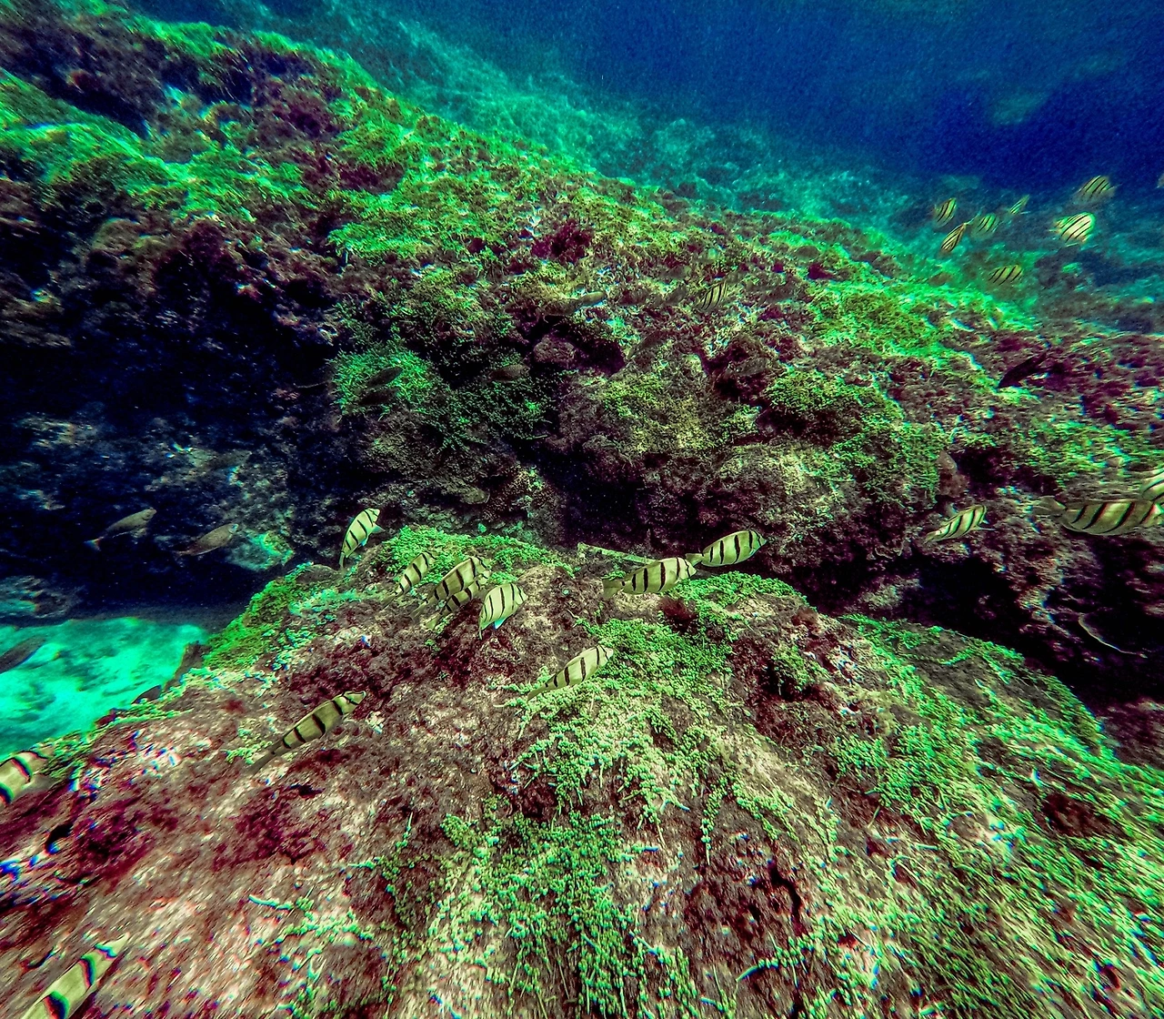 • 수트로 갈아입고 가게 트럭을 5분 정도 타고 해변으로 갔다. 해변에서부터 점점 깊어지는 바다로 들어가는데, 일단 수트와 구명조끼가 있어 가라앉을 일은 없고, 무엇보다도 주인 아저씨가 같이 들어가서 천천히 튜브를 끌어주기 때문에 힘들면 튜브를 붙잡고 편하게 스노클링을 할 수 있어서 좋았다. 이시가키에서처럼 모터보트를 타고 멀리 나가서 하는 스노클링은 아닌지라 물고기가 이시가키만큼 많진 않았지만, 여기도 제법 물고기들이 있었다. 바다뱀도 있었고, 몇몇은 바다거북이도 봤다고 한다.