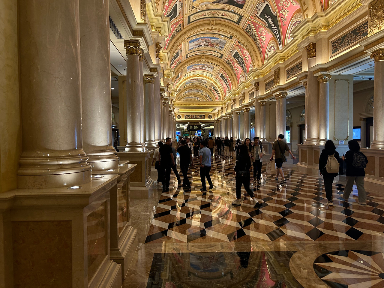기본적으로 한국은 카지노가 강원랜드를 제외하고는 불법인지라 카지노는 처음 들어가 본 것이었다. 규모가 어마어마하게 크다고 듣기는 하였으나 호텔 크기는 정말 궁전 하나를 지어놓은 것 같았다. 내 느낌상이지만 건물 크기만 보면 아마 베르사유 궁전보다 더 클 것도 같았다. 실제로 투숙하는 객실도 많지만, 호텔 1층 중앙에 떡하니 굉장히 큰 카지노가 있었다. 중앙에 있기에 1층 어디에서도 출입이 쉽게 만들어놓았으며, 입구마다 가드를 배치해 놓고 신분증 검사를 하고 있었다. 여권을 보여주고 들어가니 생각보다 분위기는 쾌적하였다. 야쿠자들이 많거나, 간간히 깽판을 치는 사람이 있을 줄 알았는데, 다들 화를 내지도 않고, 즐거운 표정을 짓지도 않고, 무덤덤한 표정으로 카지노를 하고 있었다. 특히나 등산복을 입은 50대 정도 아주머니, 아저씨들 (혹은 할머니 할아버지들)이 많았는데, 다들 1000 달러 (17만 원) 짜리 칩들을 몇 개씩 한판에 1분 정도 걸리는 바카라에 걸고 있었다. 도대체 이 사람들 행색은 이리도 남루한데, 본업이 무엇일까 궁금해졌다. 다들 중국에서 한자리하는 기업 간부나 회장님들 아닌지…