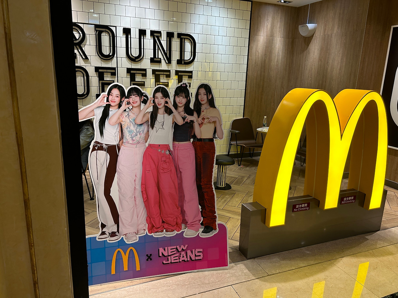 시간을 보니 오후 8시쯤 되었는데, 이곳은 창문도 없을뿐더러 상점가 천장에는 심지어 인공으로 하늘까지 조성해 놓아서 밤인데도 마치 낮에 돌아다니는 것 같은 기분도 낼 수 있다. 이곳은 작은 하나의 도시 같기도 하다. 음식점들도 물론 있고, 지나다 보니 맥도날드가 있어서 마카오의 맥도날드도 맛볼 겸 들어가 보기로 하였다. 홍콩도 그렇지만, 여기도 뉴진스가 제법 인기가 있나 보다. 뉴진스 입간판이 서있고, 뉴진스 콜라보 메뉴도 있었다. 한국에서 어딜 가도 뉴진스 광고를 볼 수 있는데, 이곳도 이제 뉴진스에게 지배당한 것이다.
