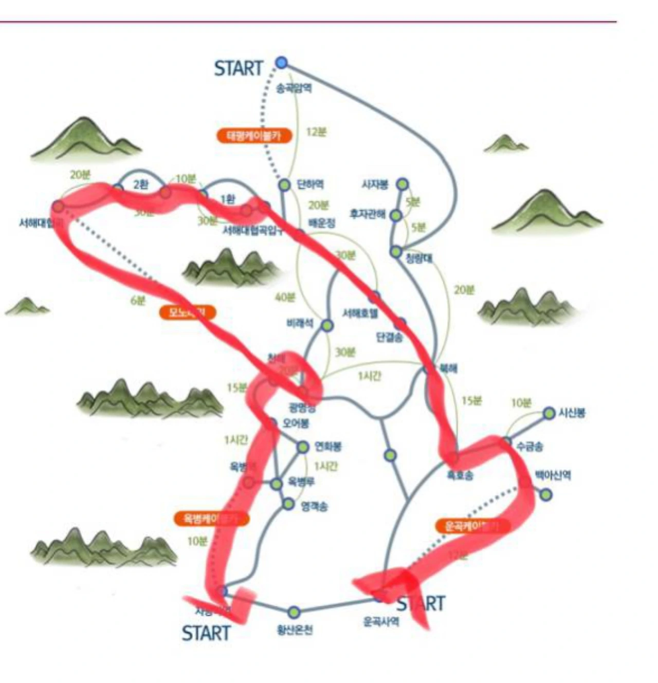• 우리는 케이블카를 타고 올라 아래와 같은 코스로 단결송 - 서해호텔 - 서해 대협곡 - 광명정 - 옥병루 - 옥병케이블카 코스로 내려올 계획이었다.