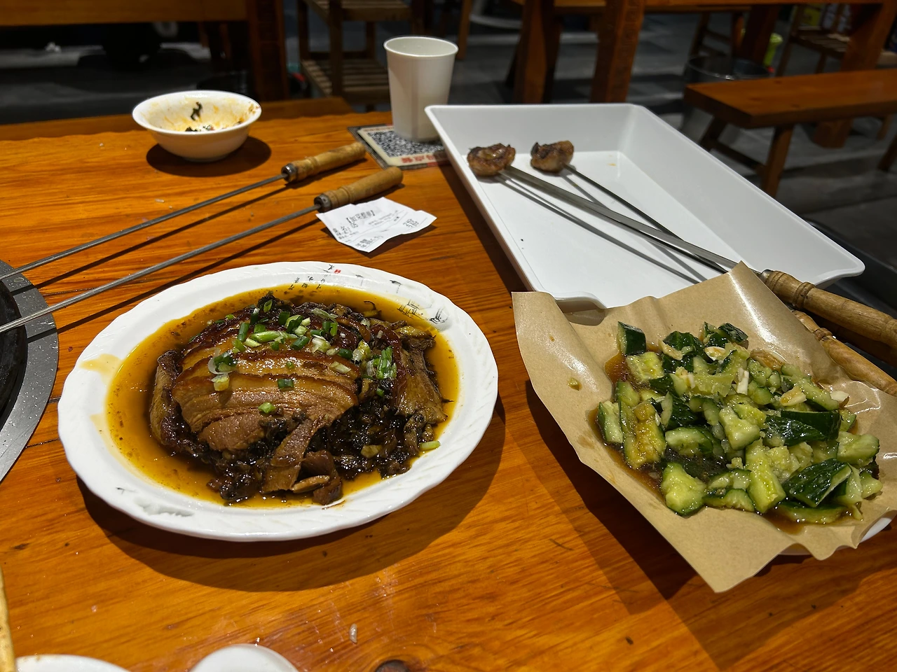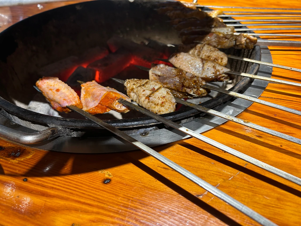 • 양, 소, 돼지 등등 다양한 고기와, 내장 꼬치들을 우리가 원하는 개수만큼 시켜서 먹을 수 있는 방식인데, 양꼬치처럼 돌아가는 무언가에 꽂아놓는 게 아니라, 중간에 커다란 숯불화로가 있어서 직접 꼬치를 놓고 익혀먹는 방식이었다. 그 밖의 야채와, 간장에 조려서 찐 삼겹살도 같이 시켰다. 요리도 맛있고, 스모키 한 향이 밴 꼬치들도 정말 맛있었다. 양의 신장도 시켰는데, 비주얼상 차마 나는 먹지 못하고, 같이 간 동료만 먹었다.