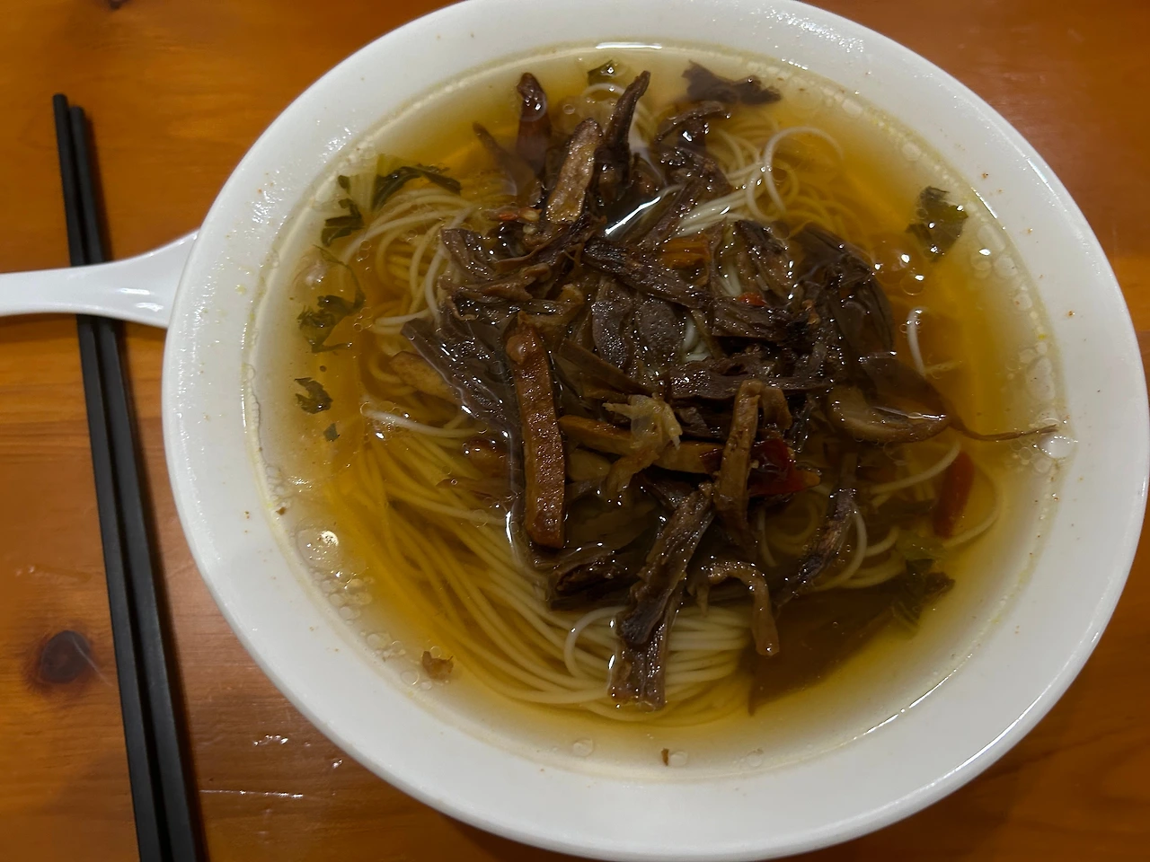 • 일어나 보니 6시가 조금 넘은 시간에 숙소 식당에서 10위안 (약 2000원) 밖에 안 되는 돈으로 죽순국수를 먹을 수 있었다. 고기 고명대신 죽순이 있는데, 약간 멸치국수에 둥굴레차를 섞은 듯한 꽤나 고소한 맛이었다. 산에 오르기 전에 든든하고 맛있게 한 끼를 하고 봉고차를 탔다.