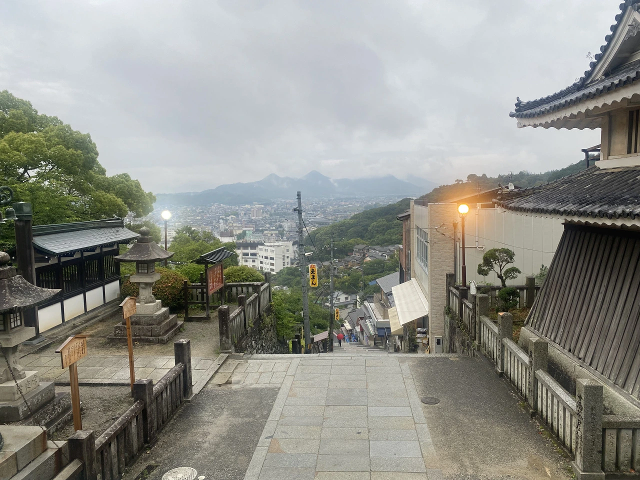 계단을 오르느라 꽤나 힘들었지만, 고토히라궁에서 산 너머를 보니 타카마쓰가 속해있는 카가와의 경치가 잘 보였다. 비가 내려 약간 안개 같은 것이 끼었다만 오히려 신사의 신비로운 분위기와 더 잘 어울리는 것 같기도 했다. 거대한 건물들을 구경하고, 다시 내려오려 보니 내려오는 길에 양쪽에 절에 헌금한 사람들의 이름들이 새겨진 비석들이 있었다. 새겨진 금액은 대개 백만 엔, 이백만 엔이었다. 새겨진 연도는 쇼와 50년쯤 되었고 (1975년), 어떤 갑부들이었는지 잠깐 궁금증이 생기기도 하였다. 더 내려오려고 보니 거의 6시가 되어 어둑어둑해지려 하고, 계단옆 가로등에 불이 켜지기 시작했다. 추적추적 내리던 비는 다행히도 많이 그쳤다.