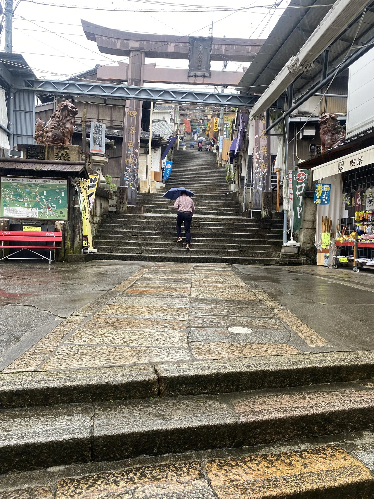 다행히도 우산을 사러 가는 방향이 신궁으로 가는 방향과 같았다. 마을 초입에서부터 신궁까지 가려고 보니 계단이 꽤 많아 보였다. 계단이 시작되는 인근에서는 지팡이를 대여해 주는 곳도 몇몇 보였다. 계단을 걷는데 지팡이까지 필요한가 싶어서 걷다 보니 정말 이제 도착인가 싶을 때 또 계단이 나타나고, 도착인가 하면 다시 계단이 나타나는 과정을 몇 번인가 반복했다. 걸어도 걸어도 끝이 보이지 않는 이 계단의 수를 알아보니 1368개나 되었다. 그래도 계단을 걷다 보니 상점가 역시 양쪽에 끝없이 있어서 가는 길이 그렇게까지 지루하진 않았다.