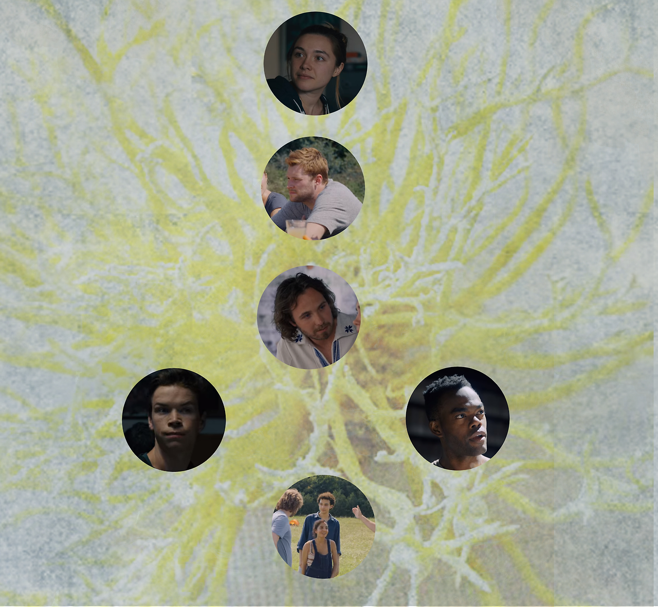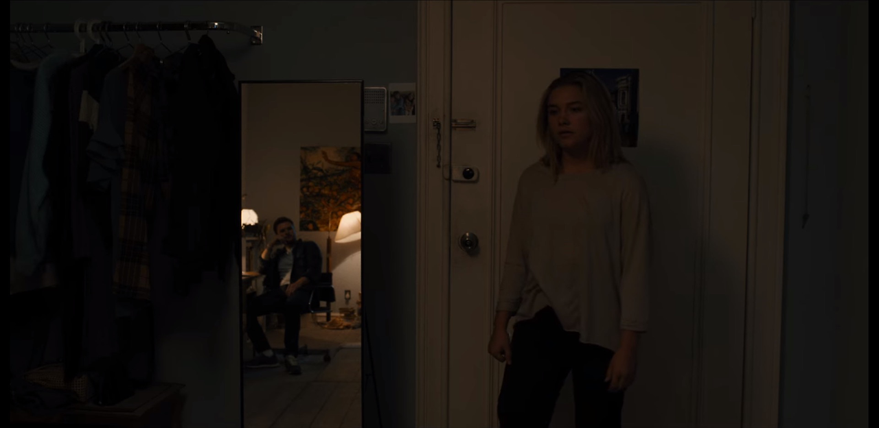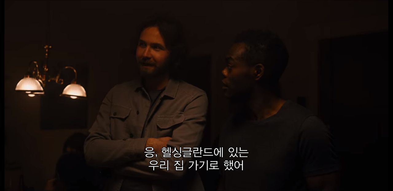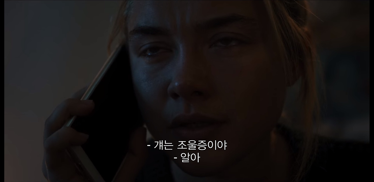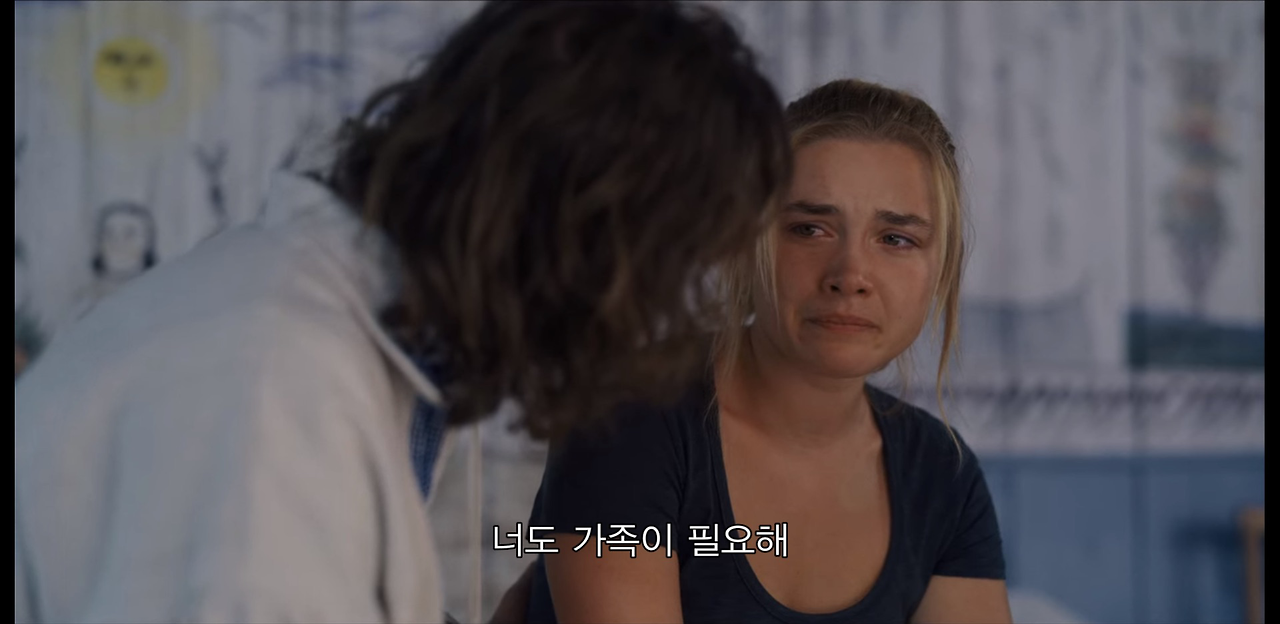 가족 이야기를 하자마자 트리거에 눌린 대니는 공황에 빠져 화장실로 들어가고, 이 또한 한 번이 아닌지 비행기 화장실에서도 비슷한 증세를 겪는 연출과 연결되어, 여행을 가는 기점으로, 하지제로 가는 장면으로 넘어간다.