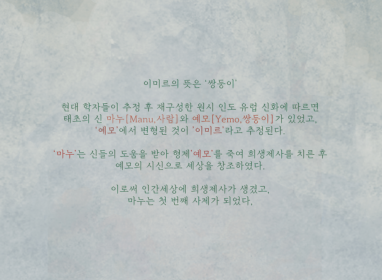 마누는 신들의 도움을 받아 형제 ‘예모’를 죽여 희생 제사를 치른 후 예모의 시신으로 세상을 창조하였는데,