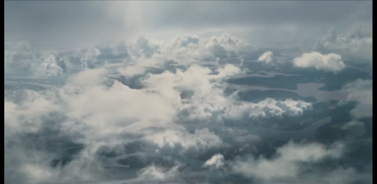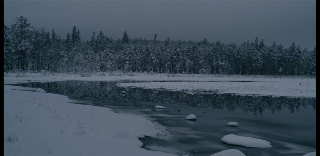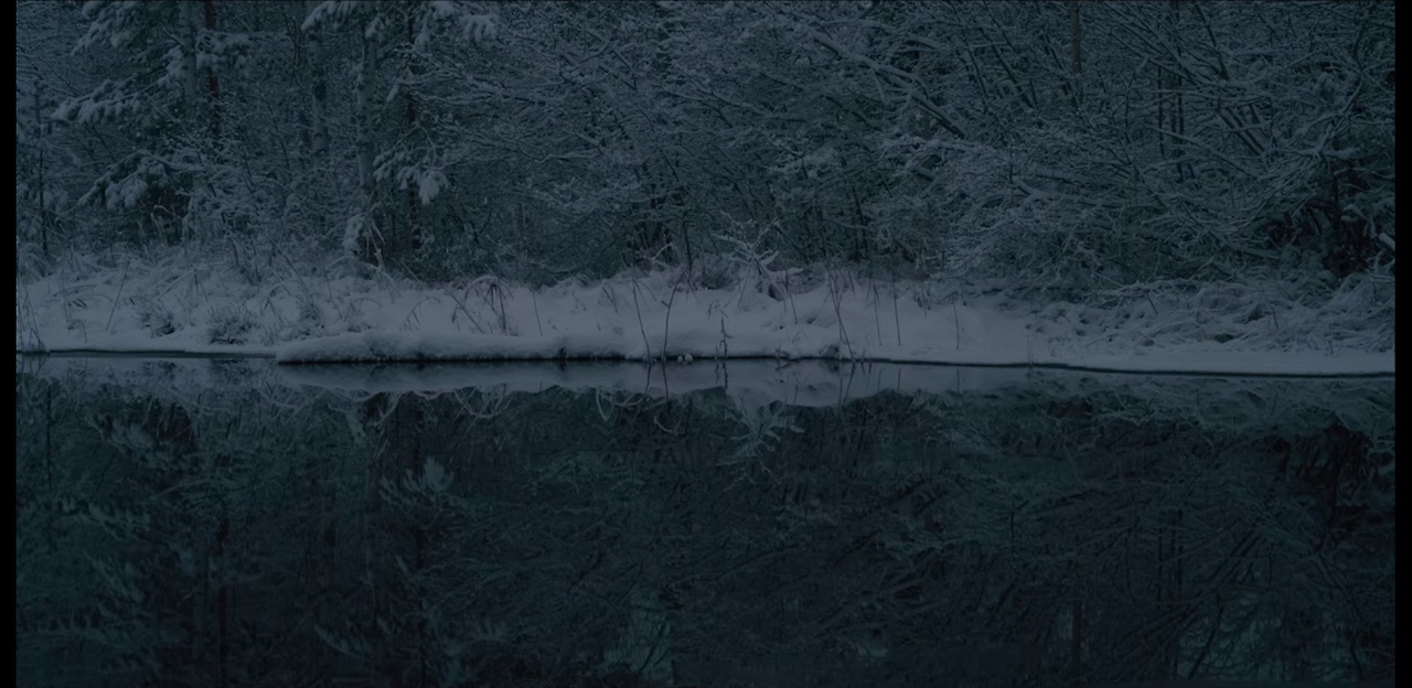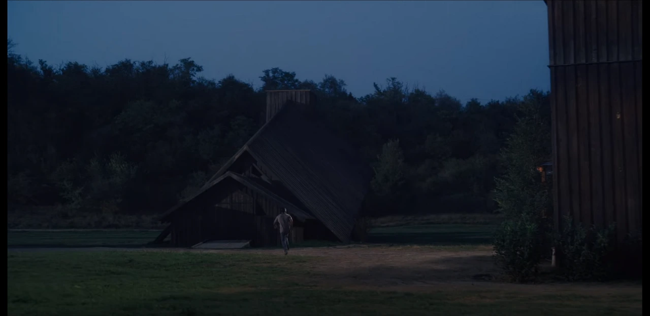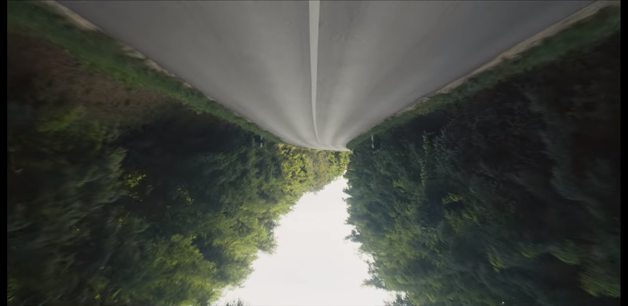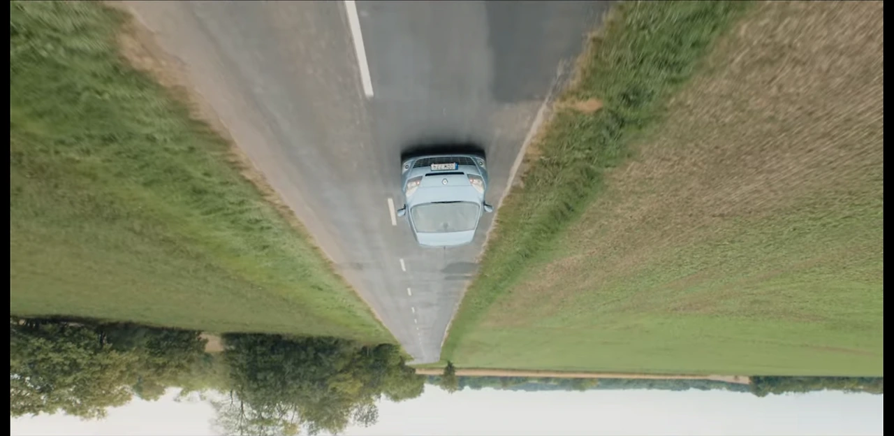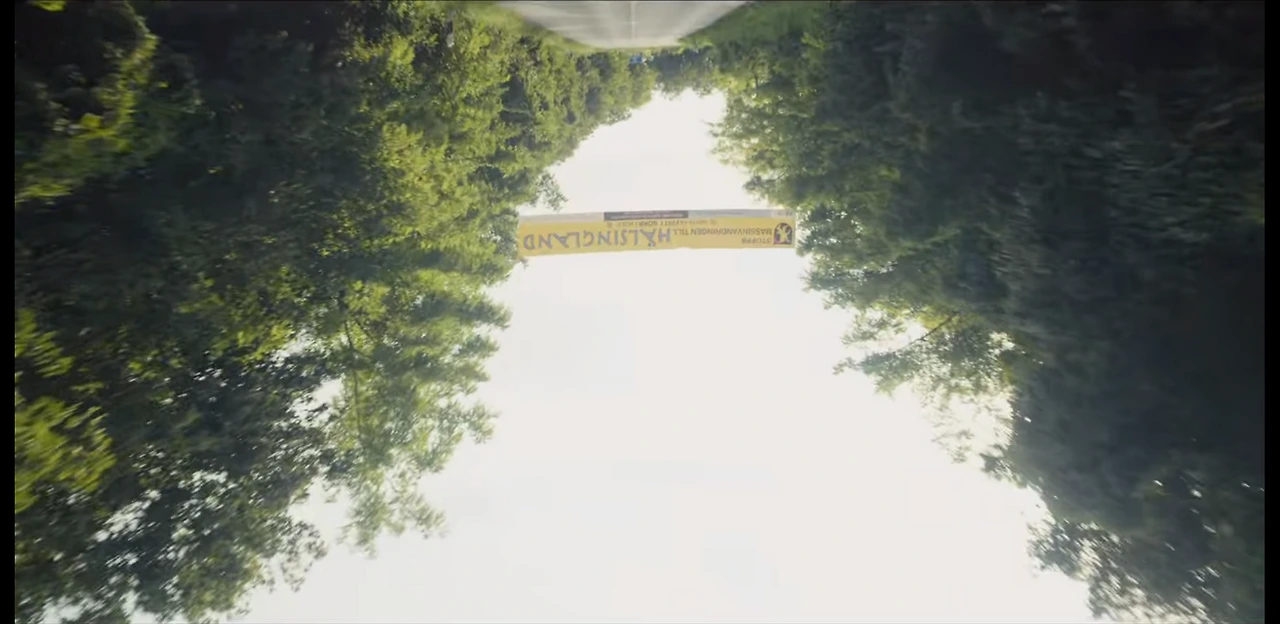 차가 쭉 지나가며 환경이 반전되고, 여름 나무 틈 사이로 거꾸로 빨려 들어가며 ‘헬싱글란드’라는 마을 현수막이 나온다.