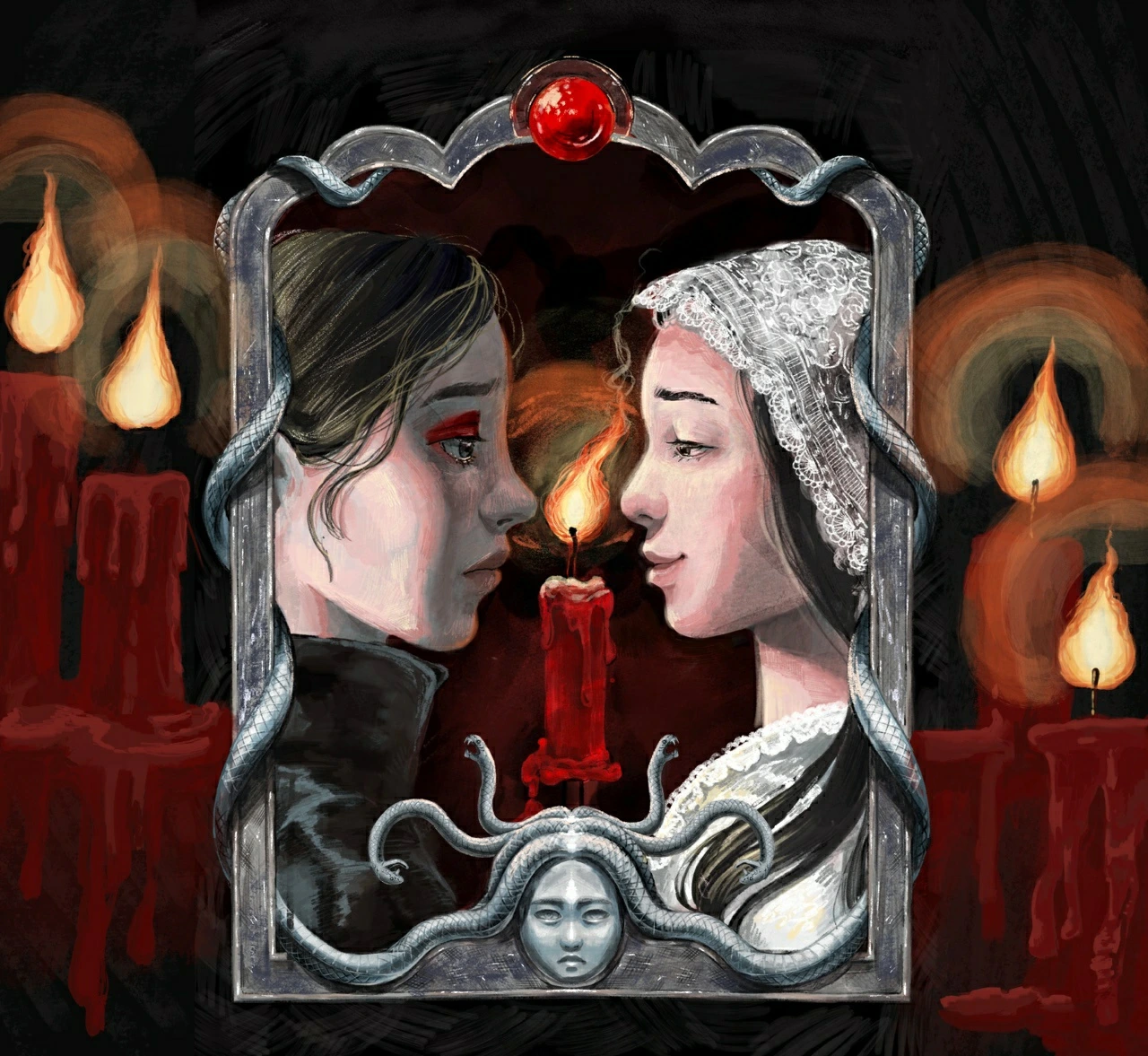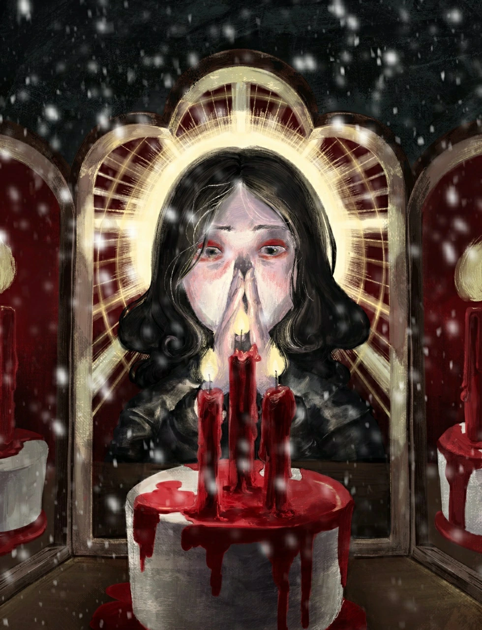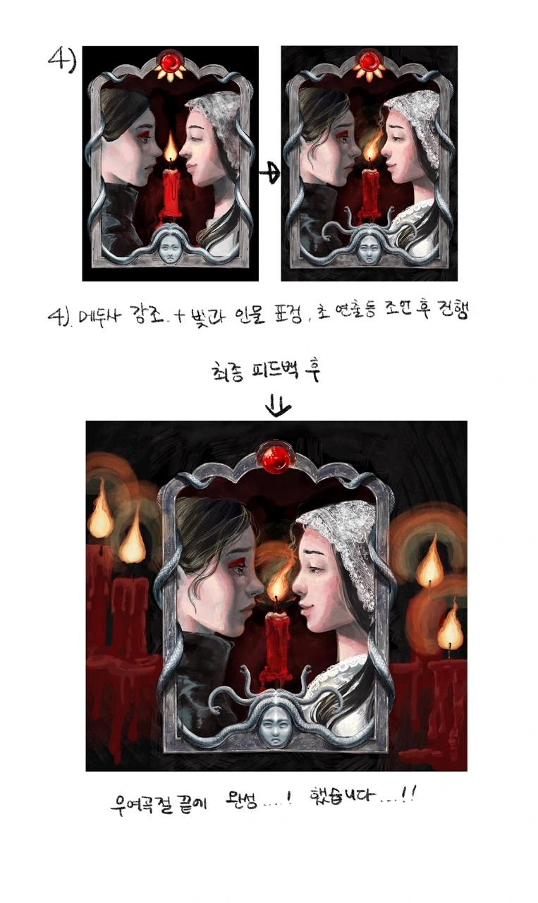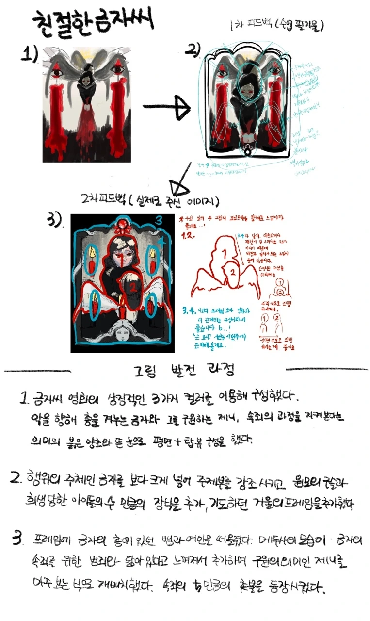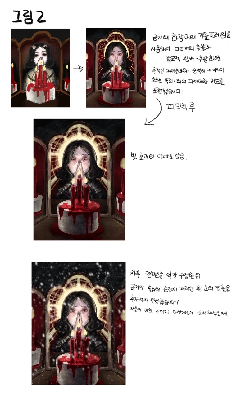 이 장면이 모순적인 인간의 모습이 잘 담겨 있다고 생각해 그리고 싶었기에 선하고 싶었던 금자의 모습을 마리아 형상을 입히고, 헤일로도 그렸습니다.