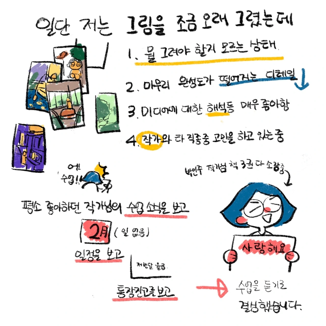 앞으로 나아가는 길에, 적어도 그림으로 먹고살 수 있고, 작가가 되었을 때 잘 살 수 있으리라는 희망을 느끼셨으면 좋겠다는 생각이 들었습니다.