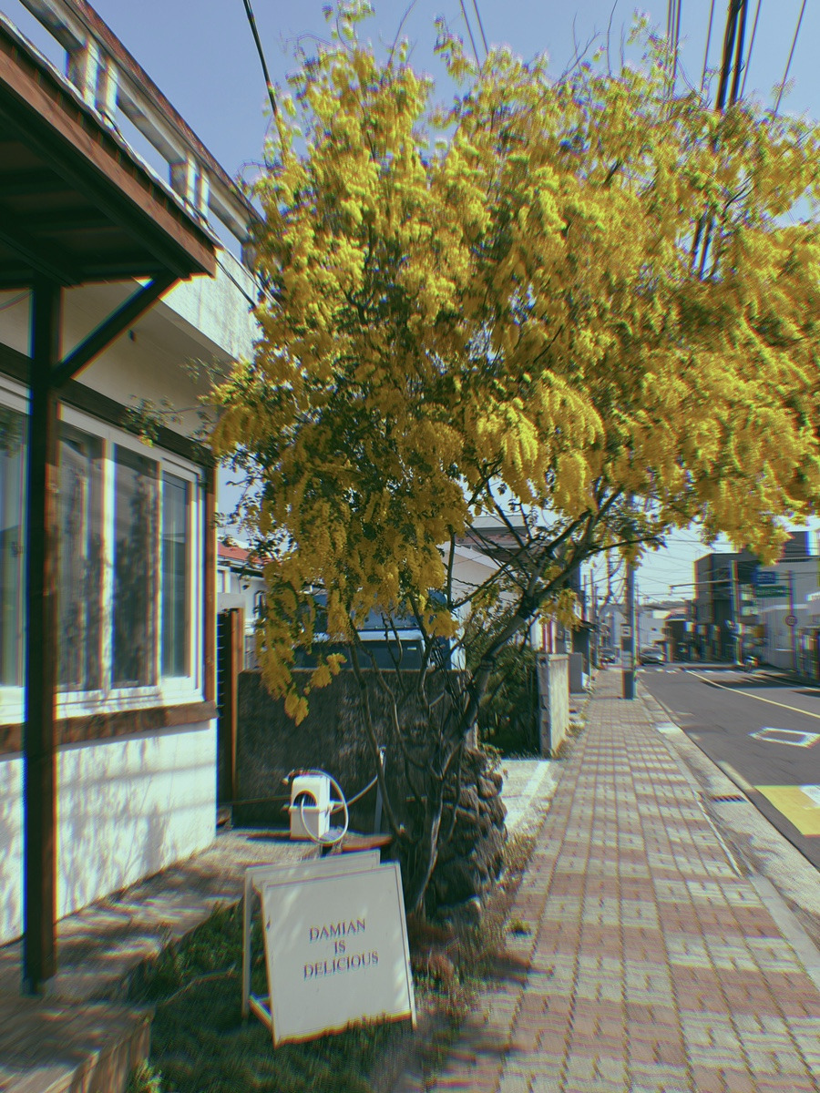 마지막 날은 제주공항에 가기 전까지 특별한 계획을 세우진 않고 여유로운 마음으로 돌아다녔는데, 점심을 먹으러 간 법환동에서 예쁜 빵집을 발견했다. 옛날 동화에 나올 것 같은 작은 빵집이었는데, 이름 모를 노란 꽃을 주렁주렁 매단 나무가 있었다. 빵집 주인분께 여쭤보니, 호주 아카시아라고 했다. 아카시아 향기는 거의 나지 않았지만, 그 노란 모습만으로도 시선을 잡아두는 힘이 있었다. 법환동의 평화로운 분위기와 아카시아, 내가 보고 싶었던 봄의 제주가 이 모습이었구나- 싶었다.