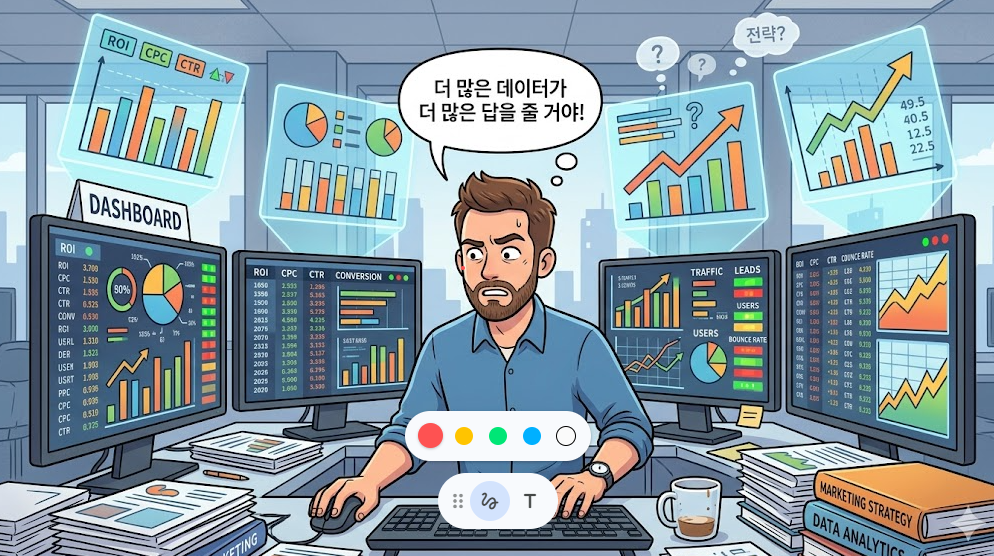 근데 문제는 여기서 생긴다. 마케터는 대시보드가 화려해질수록, 숫자가 많아질수록, 거기서 뭔가 답이 나올 것 같은 착각에 빠진다. 데이터를 더 쌓으면 전략이 보일 거라고 믿는다. 그래서 더 많은 툴을 구독하고, 더 많은 지표를 만들고, 더 두꺼운 리포트를 찍어낸다. 그런데 숫자를 나열한다고 전략이 되지 않는다. "이번 달 CTR이 2.3% 상승했습니다"는 발자크가 "오늘 파리 시장에서 귀족 부인 한 명을 봤습니다"라고 노트에 적은 것과 다를 게 없다. 관찰이다. 거기서 멈추면 아무 일도 일어나지 않는다.