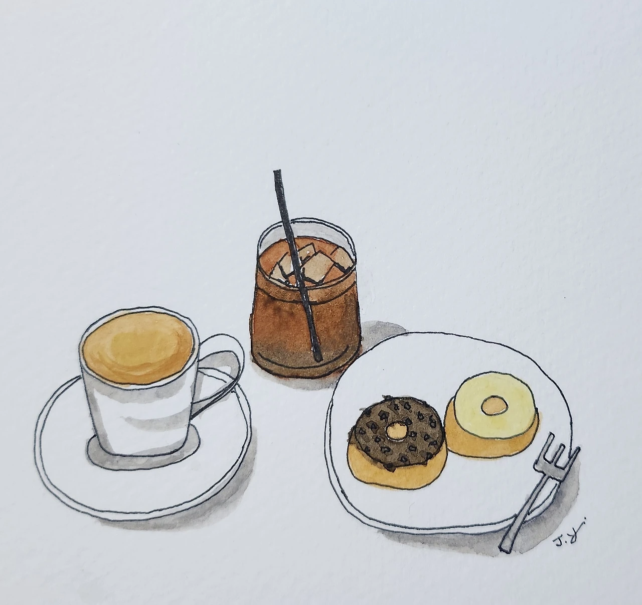 시원한 아이스티를 시키고 도넛도 시켜줬다. 아이는 약속대로 책을 보면서 오물오물 도넛을 먹었다. 달콤한 도넛 한입에 시원한 아이스티를 마시니 아이의 기분이 좋아 보였다.