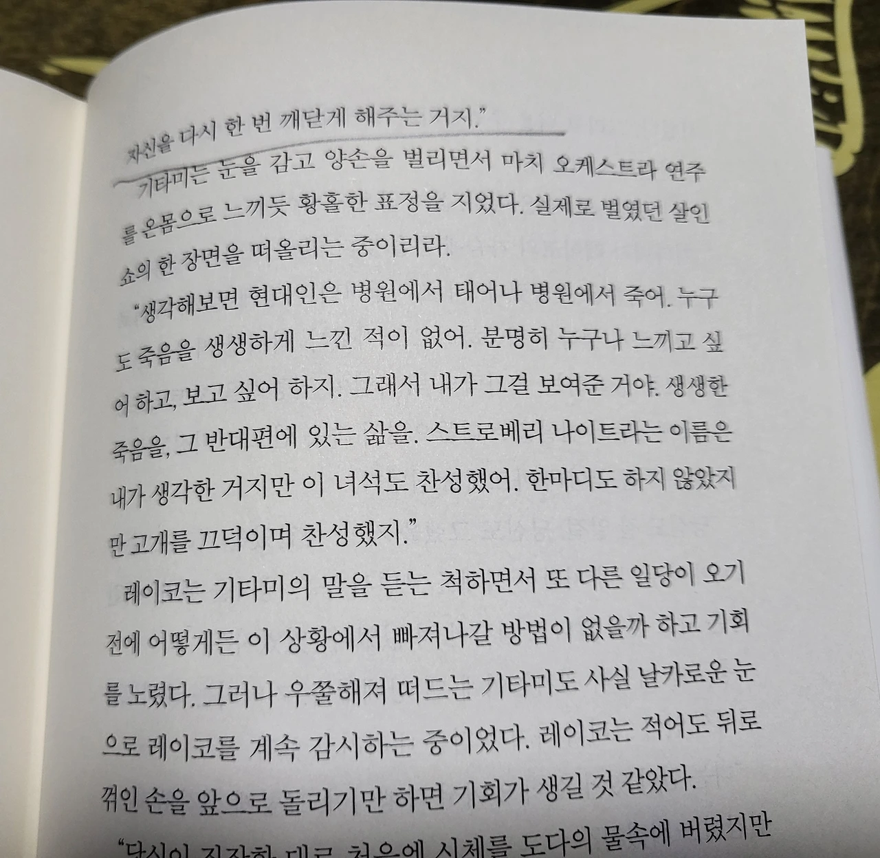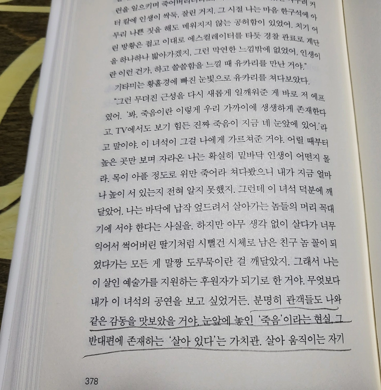 " 눈앞에 놓인 '죽음'이라는 현실 그 반대편에 존재하는 '살아 있다'는 가치관, 살아 움직이는 자기 자신을 다시 한번 깨닫게 해주는 거지."