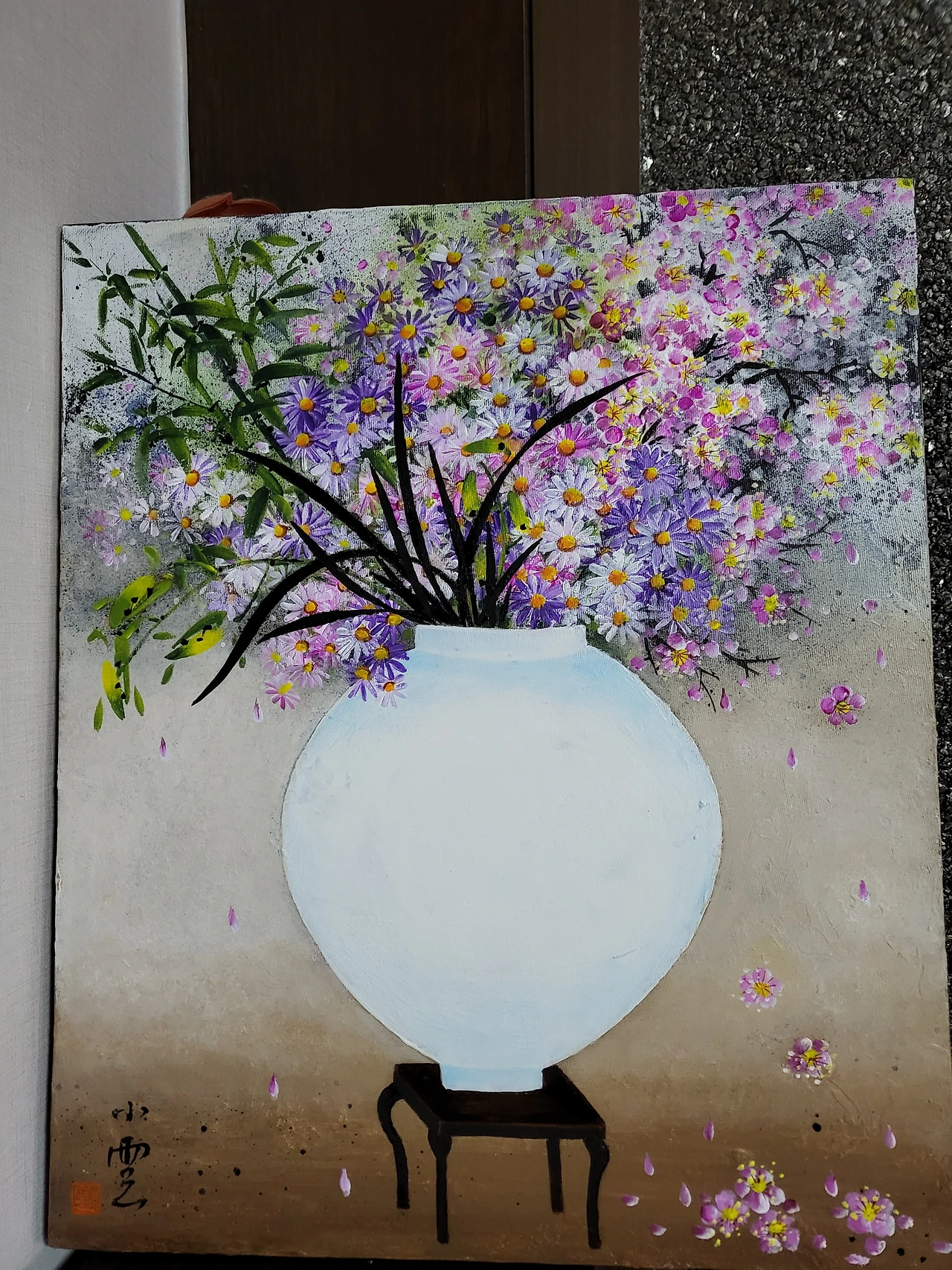 낙찰을 받으면 보통 액자를 짜서 벽에 걸어 감상을 하는데 저 작품은 캔버스 상태로 감상을 하고 있다