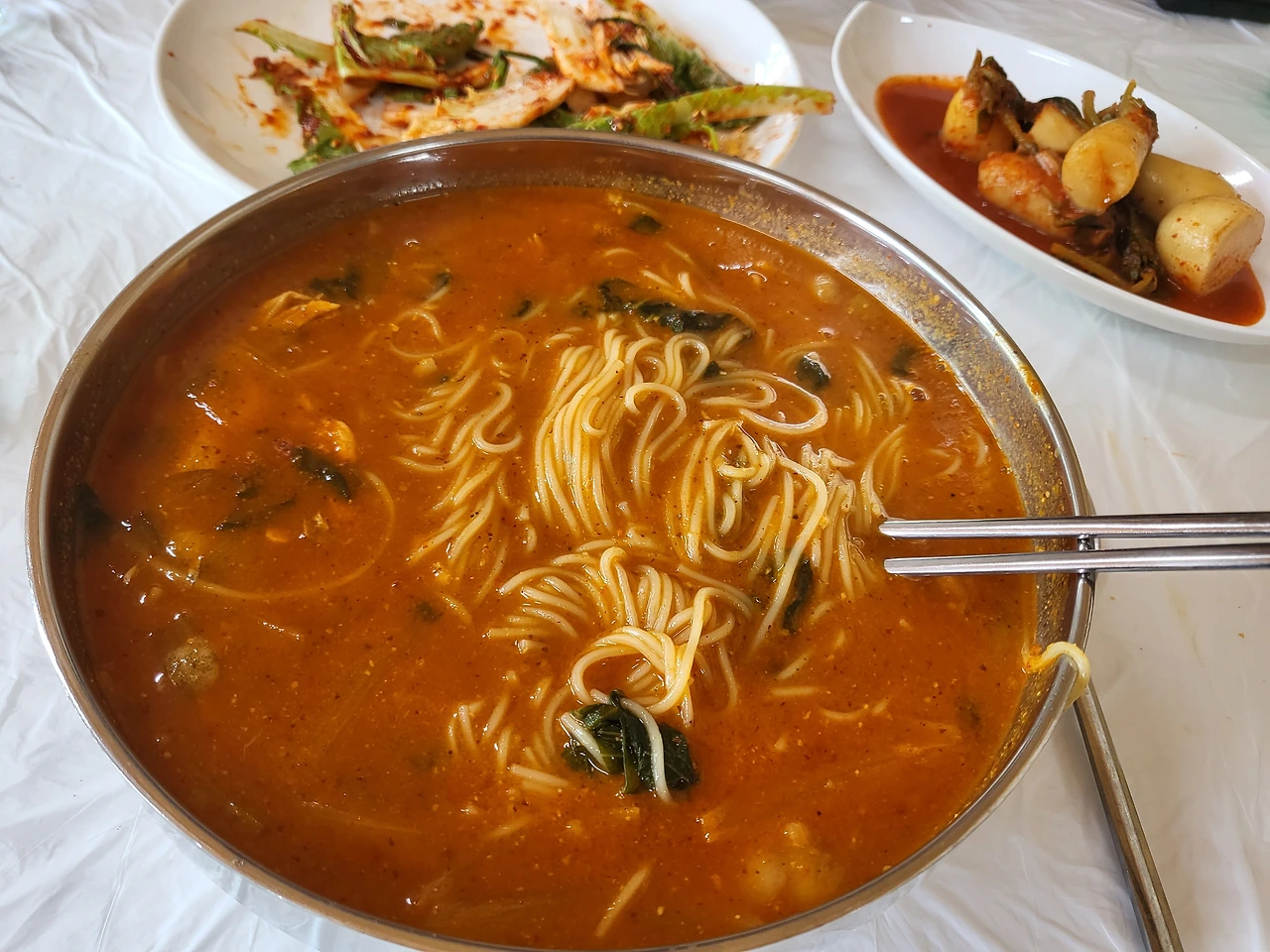 메기살을 으깬 얼큰한 국물 베이스에 국수를 넣고 끓인 것이다