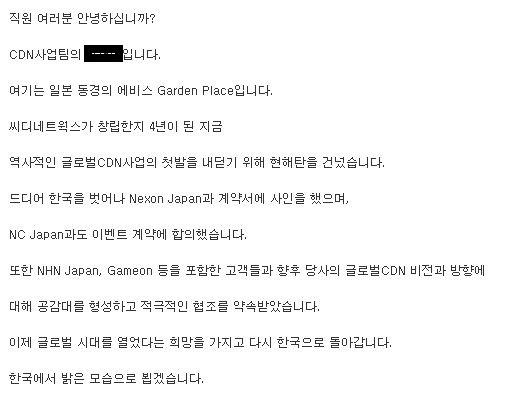 그래서 도쿄의 테헤란로라 불리던 에비스에서도 제일 비싸다는 Ebis Garden Place에 입주해 있던 NHN Japan의 네트웍팀장에게 양해를 구하고 그의 PC를 빌려서 우리 회사 전 직원을 수신인으로 하여 다음과 같은 메일을 보냈다.