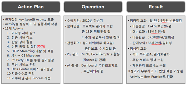 COO를 맡고 있던 김형석 부사장이 직접 Project Head가 되어 총 11가지의 Action Plan을 마련하고 매주 회의를 통해 실적을 체크해 나갔다. 이러한 노력의 결과로 프로젝트 착수 3개월 만에 월 1.8억의 비용 절감 외에도 관련 프로세스를 개선하는 성과를 거두게 되었다.