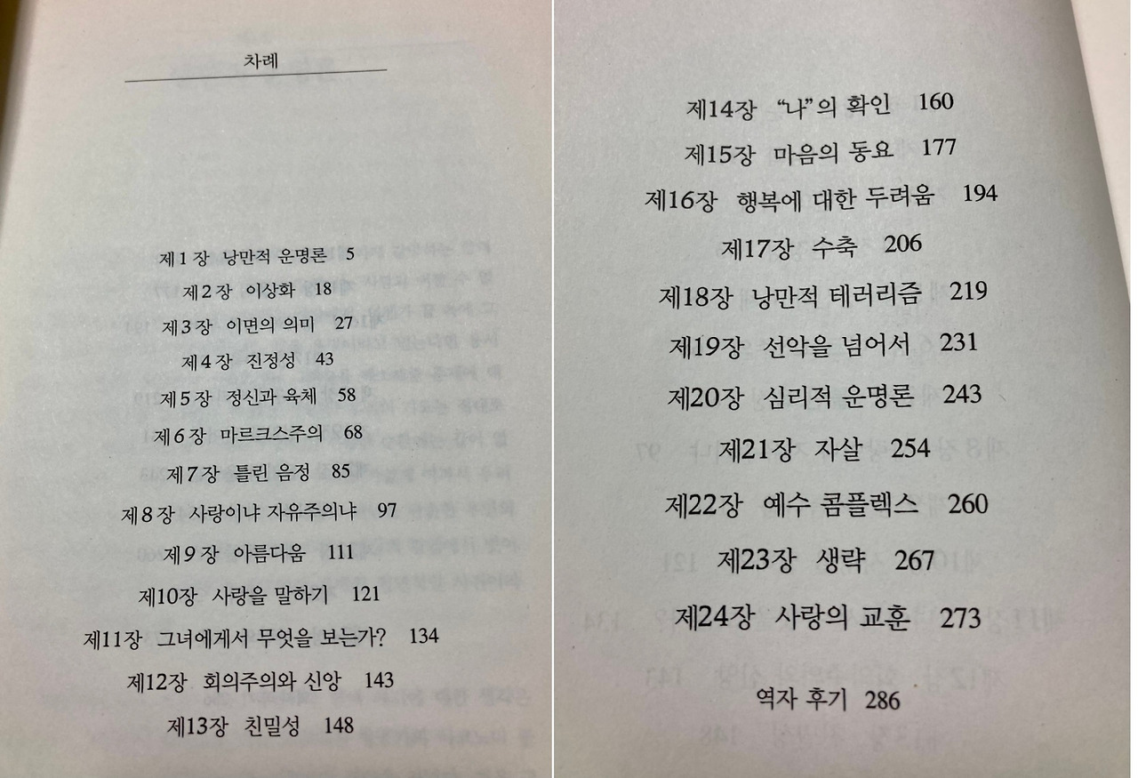 줄거리만 보면 흔한 로맨스 소설 같다. 그런데, 목차를 보면 마치 철학책을 보는 듯 하다. 그래서 책 표지를 다시 보면 분명히 제목 앞에 '소설'이라고 쓰여있다. 나처럼 목차를 보고 놀란 사람들을 위해 일부러