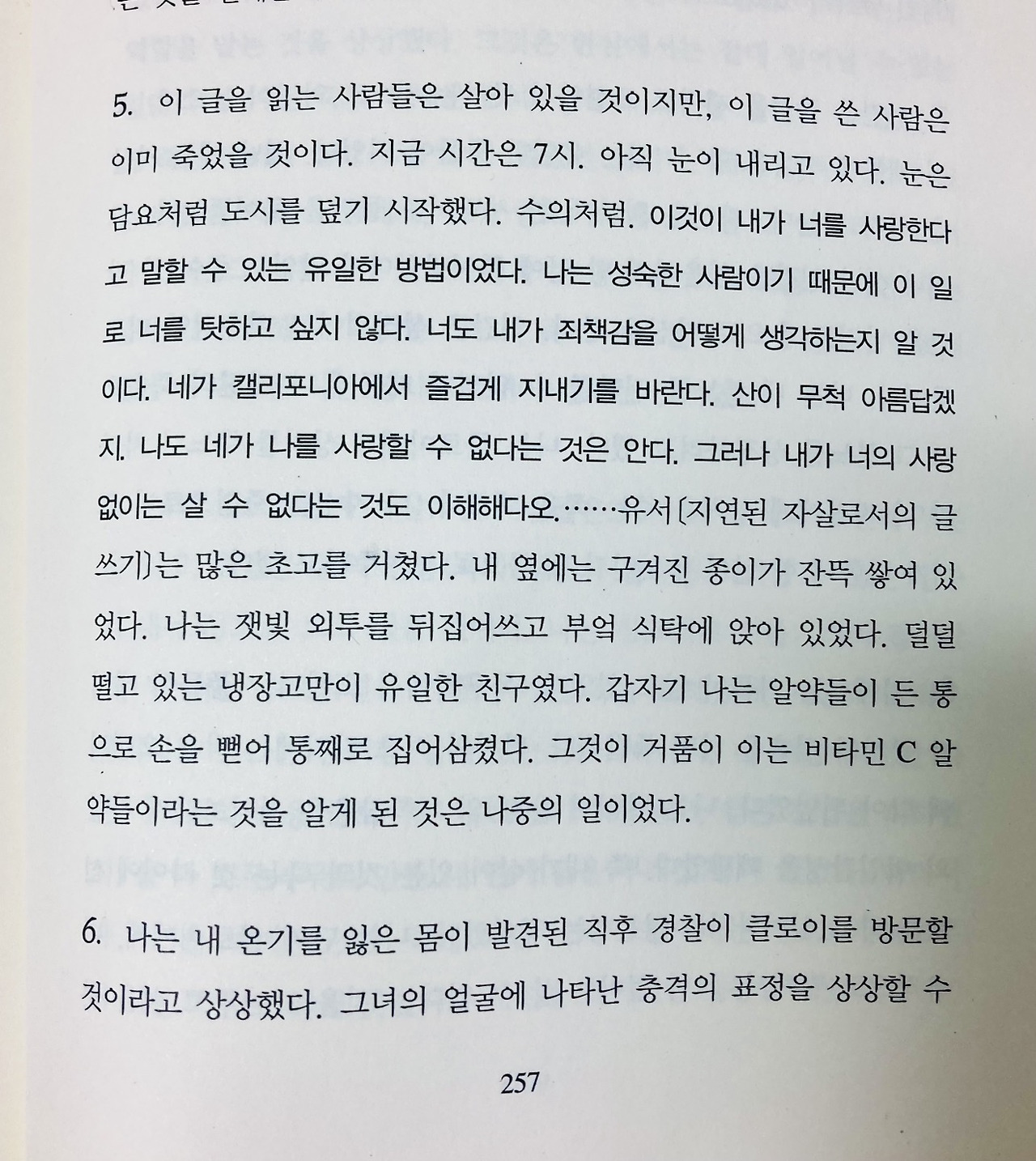 라며, 집안에 있는 온갖 약들을 다 꺼내서 식탁에 올려놓고 여러 번 초고와 수정을 거쳐 유언을 쓰면서, 유언이 발견될 때쯤이면 자신의 몸은 싸늘하게 식어 있을 것이고, 경찰의 연락을 받고 달려온 전 여자 친구가 눈물을 쏟으면서 그동안 자기를 이해하지 못하고 잔인하게 굴었던 것을 뼈저리게 후회하며 가슴을 치는 상상을 하는 부분에서 나는 무릎을 쳤다.