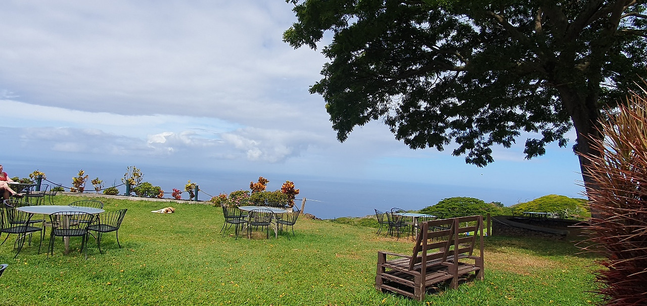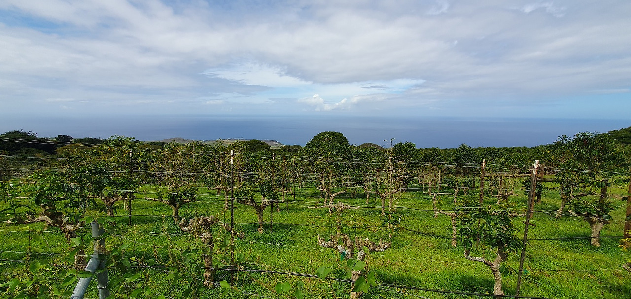 한참을 올라올라 하늘과 맞닿은 듯한 굉장한 뷰를 자랑하는 곳에 위치한 커피 농장 켬 카페에 도착했다. 하늘과 바다의 경계가 희미해져 하늘에 뜬 느낌이었다. 눈앞에 펼쳐지는 나지막이 줄 맞춰 자라는 커피나무들의 행렬이 익숙한 과수원의 풍경이었다. "세계 최초로 커피를 와인용 포도처럼 격자 구조물을 사용해 재배했다. 이를 통해 커피콩의 단맛을 이끌어낸다. "(뉴시스 기사 인용 https://www.newsis.com/view/?id=NISX20240408_0002691601&cID=11209&pID=13000)