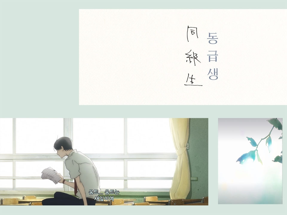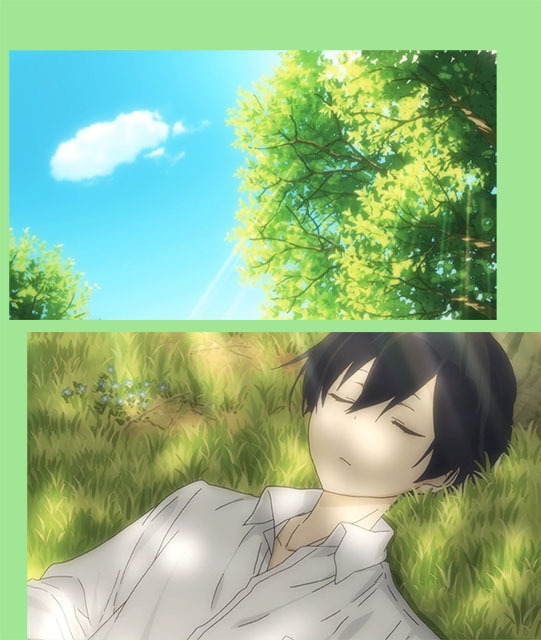 밴드 활동을 하는 쿠사카베가 같은 반 사죠에게 우연한 계기로 합창 대회 노래를 가르쳐주게 되면서 이야기가 시작되는데요, 스토리도 재미있지만 곳곳에 여름의 분위기가 산뜻하면서도 차분하게 녹아 있습니다. 멀리서 들려오는 매미 소리, 탄산음료 흐르는 소리, 잔잔하게 내려오는 빗줄기 소리 등 작품 안에서 들리는 여러 소리들이 듣기 좋고요, 작중 삽입곡들이 대부분 기타가 주가 되는 연주곡들인데 얌전한 듯하면서도 어딘가 장난스러운 리듬이 작품의 정서와 잘 어울려요. 분위기가 차분해질 때 흘러나오는 서정적인 피아노 연주곡도 좋고요. 기타 연주곡에 가사를 붙인 엔딩곡도 좋습니다, 풀냄새가 솔솔 나는 곡이에요. 물 한 방울 섞어 놓은 수채화 느낌의 색감과 원작의 유려한 그림체를 잘 살린 작화도 물론 매력적입니다. 한 컷 한 컷이 마치 동화책을 펼쳐 놓은 듯 예뻐서요, 소중히 감상하게 된답니다.