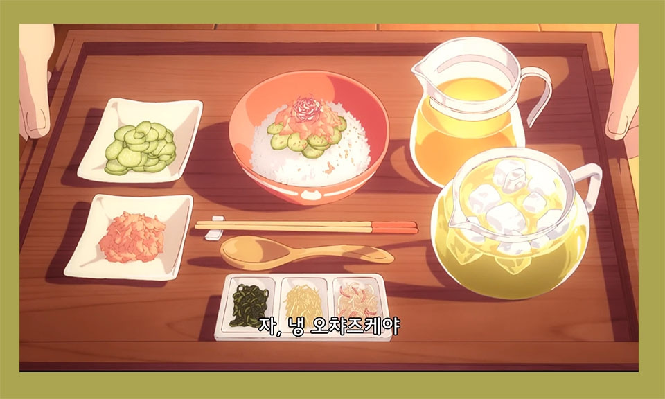 이 애니메이션은 각 회차마다 해당 계절에 어울리는 요리를 테마로 한 에피소드로 구성되어 있는데요, (아예 방영 당시 매 달 1 회차씩 방영되었다고 해요) 그래서 여름용 에피소드라 할 만한 7화를 우선적으로 넣어 보았습니다. 아예 메뉴가 냉 오차즈케(밥에 냉차를 부어 먹는 요리)이며 배경은 워터파크예요.