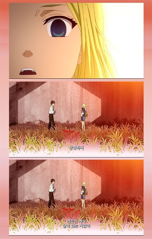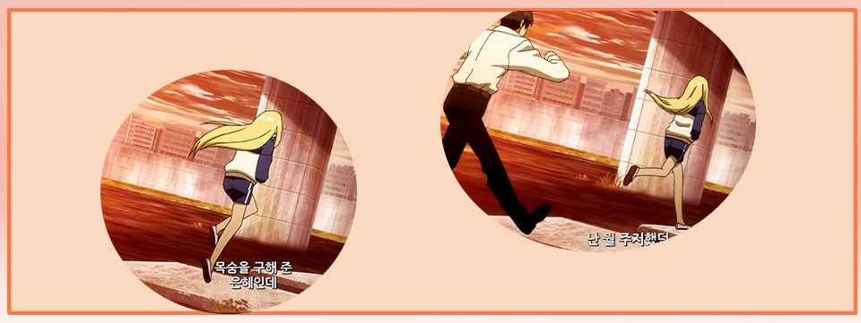 (개인적으로 가장 좋아하는, 니노와 어울리는) 투명한 유리구슬 같은 피아노 배경음과 함께 코우와 니노는 별장으로 향합니다. 나 잡아봐라 하듯 낭만적인 비주얼로 징검다리를 건너고 귀여운 자세로 헛둘헛둘 사다리까지 타며 별장에 가는 동안 코우는 생각합니다.