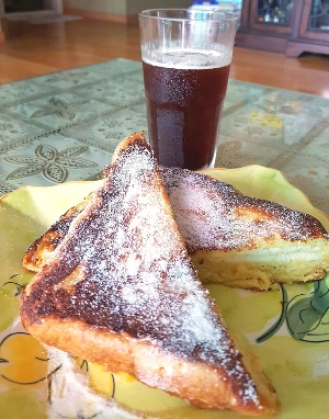 바삭하게 익은 식빵을 꺼내 집에 있는 가장 평평하고 예쁘게 생긴 그릇에 플레이팅 한다. 카페에서 파는 것을 최대한 흉내 내며, 나 또한 카페에서 돈을 지불한 손님처럼 당당하게 식탁에 세팅을 한다. 슈가파우더가 없다면 설탕과 밀가루를 믹서기에 갈아서라도 만들어 내 나를 위한 예쁘고 달콤한 한 상을 차려낸다.