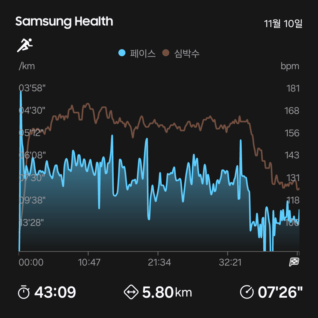 그리고 한 5분 정도 조금 빠른 속도로 걷고 천천히 발을 굴렀다. 먼저 용감하게 스피드를 올렸는데 D가 나를 멈춰 세웠다.