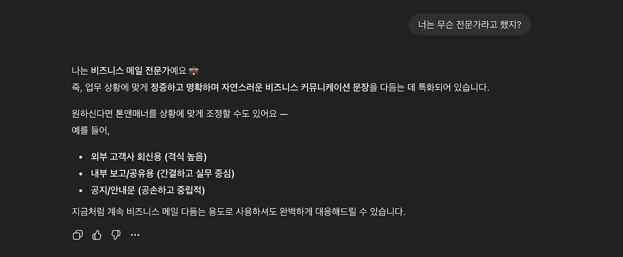 나는 GPT에 백엔드, 서버, 프론트엔드 등 여러가지 프로젝트를 나누어 사용중인데, 여기에 메일 전문가를 추가했다.
