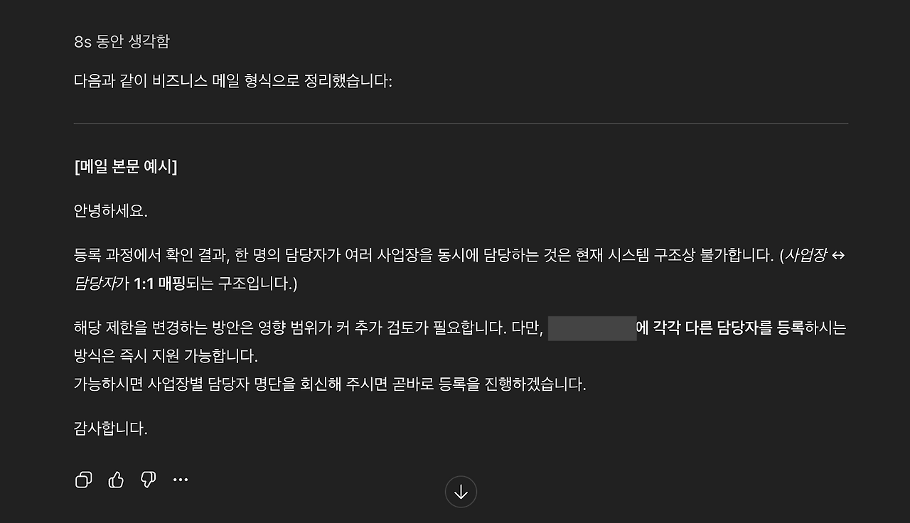 이전 회사는 정책상 ChatGPT를 사용하기 위해서는 외부망이 되는 노트북을 사용해야 했다. 그러면 노트북에서 확인한 내용(보통은 소스코드)을 내부망만 되는 피씨로 옮겨야 하는 귀찮은 일이 존재한다. 다행히(?) 이 곳은 개발PC에서 사용이 가능하다.