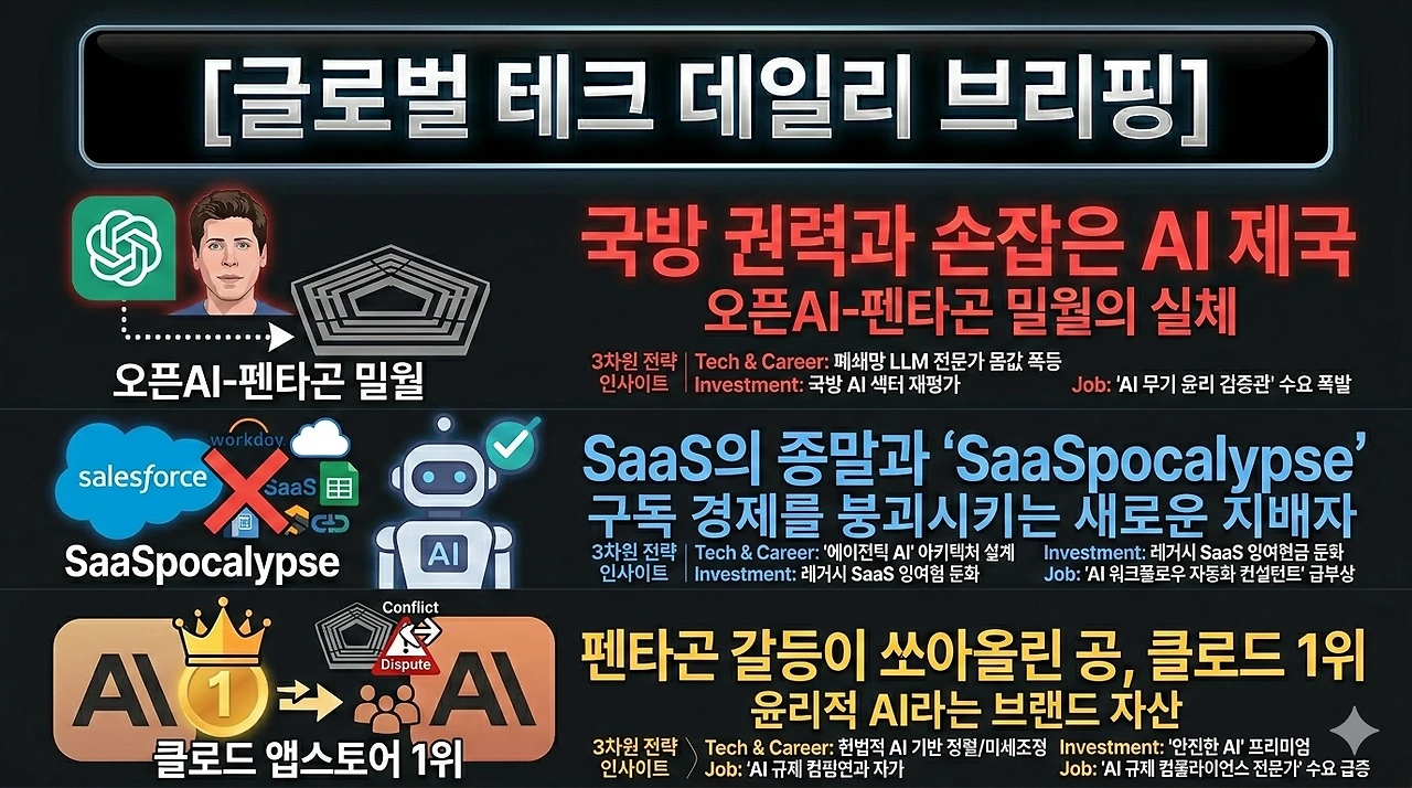 Macro & Investment (3050 개인 투자자): 팔란티어(Palantir), 안두릴(Anduril) 등 국방 AI 섹터의 밸류에이션 리레이팅(재평가) 임박. 반면, 오픈AI 등 범용 B2C AI 기업은 글로벌 규제 및 지정학적 리스크 노출로 주가 및 펀딩 가치의 변동성 확대 불가피함.
