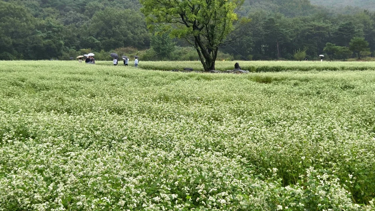 정말 돈을 주고 이 구절을 살 수 있다면 사고 싶을 정도로 아름답다. 그 뒤 혹 시골길을 걷다가 메밀꽃이 피어있으면 절로 그 자리에 발길을 멈춘다. 만약 보름달이 뜨는 밤중에 다녀올 수 있는 곳이라면 먼 길을 마다하지 않으리. 그렇게 좋아하는 메밀꽃밭이 현재 머무는 곳에서 십여 분 거리에 있다니...