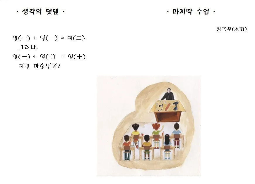 올해 그림책 제목은 "마지막 수업 - 생각의 덧댐"입니다. 모두 12장 24쪽 분량인데, 그림에 워낙 소질 없어 '사진 + AI + 그림' 셋의 합작입니다. 다만 그림 스캔을 이웃 도서관에서 했는데 상태가 좋지 않습니다. (혹 앞으로 그림책 만들 분은 돈을 좀 들여서라도 괜찮은 곳에서 하시길)