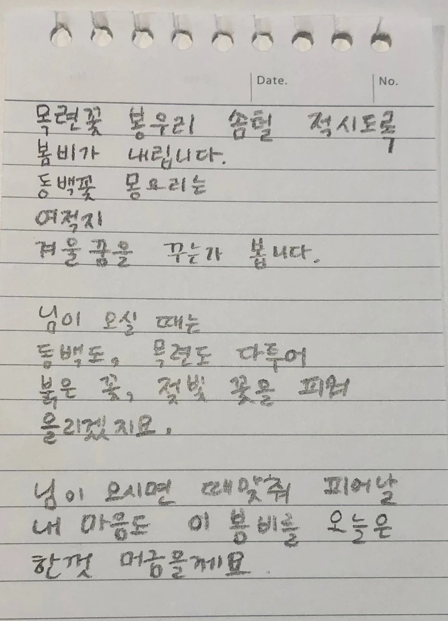 갑자기 전자우편으로 쪽지를 보내다가 손글로 편지 써 보내기가 쉽지 않으리라. 왠지 쑥스럽고 어색하다. 그럴 때 시 한 편(시가 아니더라도 읽은 수필 가운데 마음에 드는 구절) 필사하는 습관을 붙임은 어떨지.