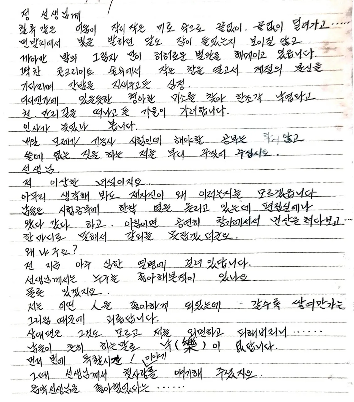 오늘 공고 제자의 편지를 읽다가 몇 번이나 고개를 갸우뚱했습니다. 편지 맨 끝에 학생의 이름이 없었다면 저를 좋아한 여학생이 보낸 편지로.