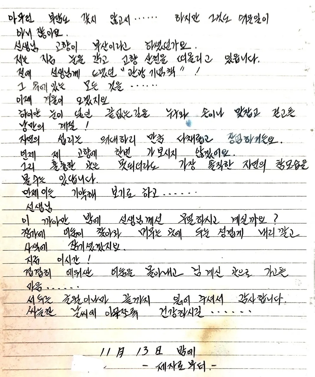 선생님, 고향이 부산이라고 하셨던가요. 저는 지금 눈을 감고 고향 산천을 떠올리고 있습니다. 전에 선생님께 드렸던 ‘관광 기념책’ 그 속에 있는 모든 것을...