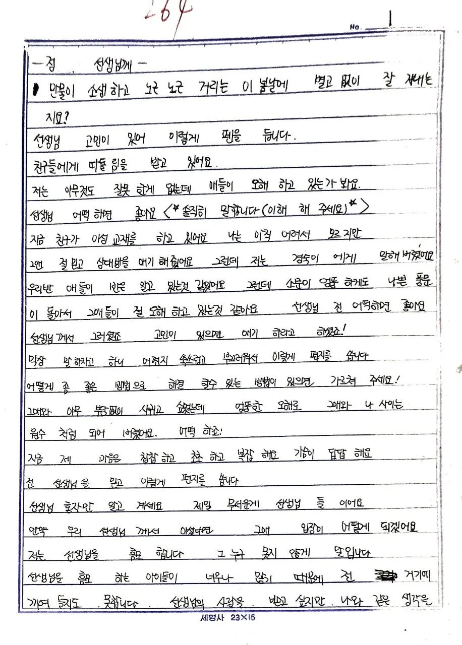 지금 제 마음은 찹찹하고 초조하고 복잡해요. 가슴이 답답해요. 전 선생님을 믿고 이렇게 편지를 씁니다. 선생님 혼자만 알고 계셔요, 제일 무서운 게 선생님들이에요. 만약 우리 선생님께서 아셨다면 그애 입장이 어떻게 되겠어요.