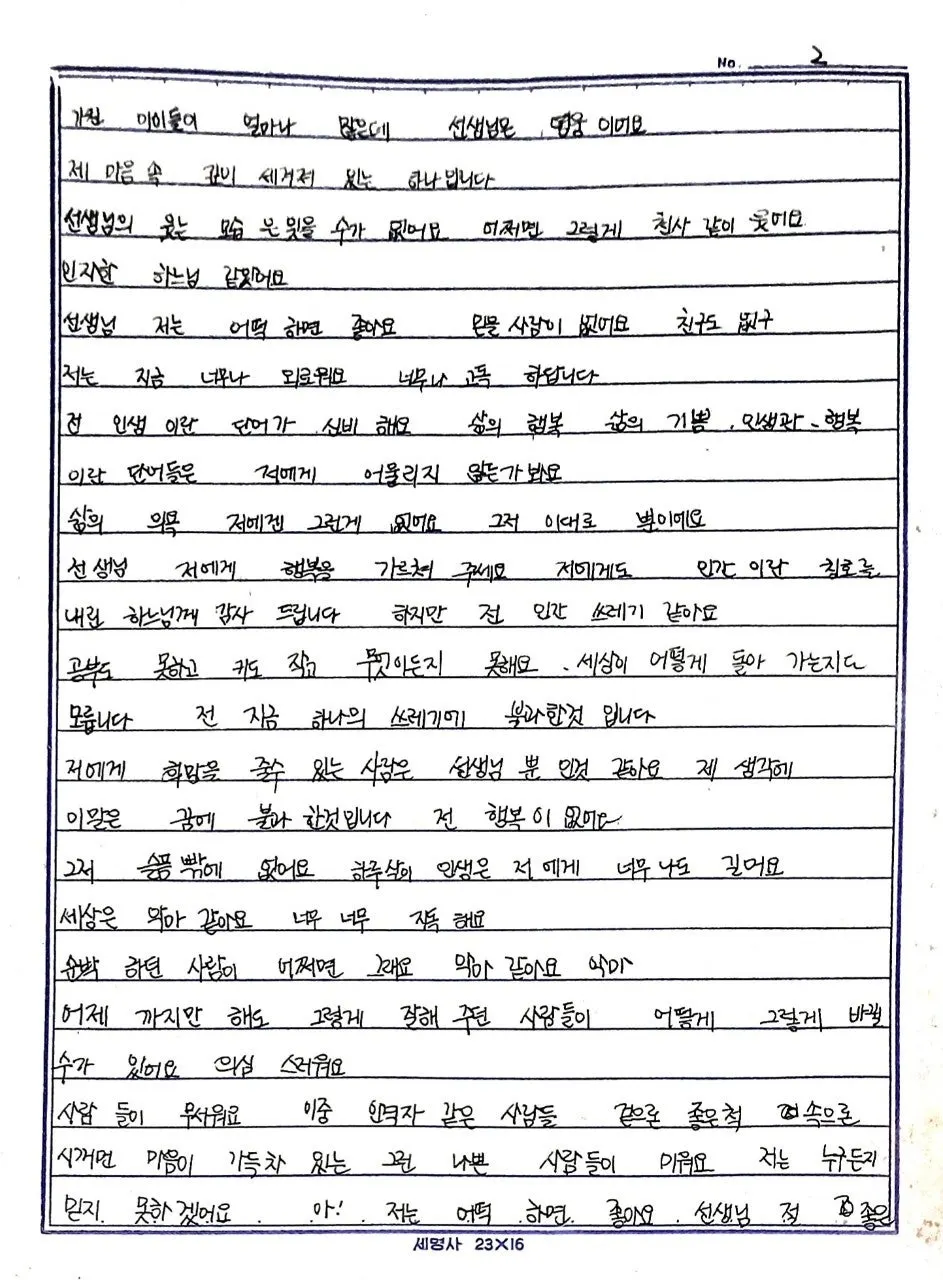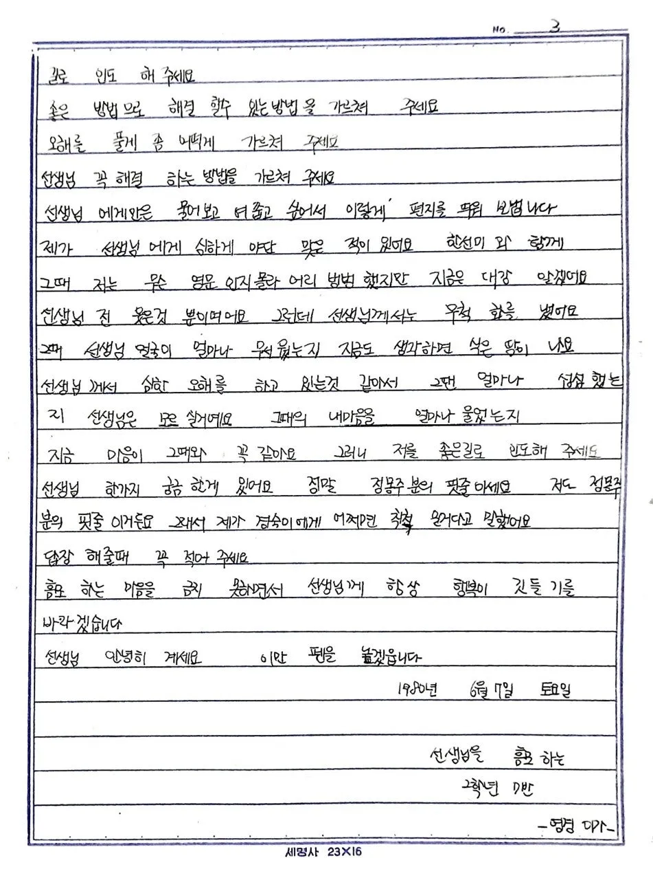 @. 제게 학교와 학생은 어느 때든 첫사랑이었고, 그때 아이들과 주고받은 편지는 첫사랑의 편지입니다. 44년 전 부산 모 여중에 근무할 때 받은 걸로 보이는데, 당시 여중 2학년 학생이 보낸 편지입니다.