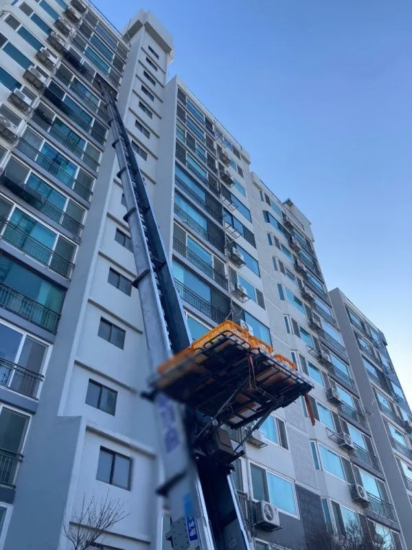 고가사다리 꼭대기가 15층 창문에 턱을 걸고