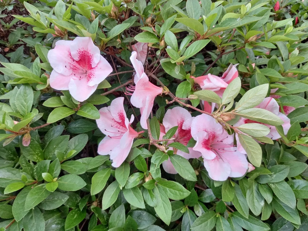 일단 빛깔부터 다르다. 3월 말에서 4월 중순에 피는 ‘올영산홍’은 그 빛깔이 대부분 아주 짙은 붉은빛이다. 우리 집은? 옅은 붉은빛, 아니면 연분홍빛이다. 멀리서 사진 찍으면 짙은 빛으로 보이나 실제 눈을 가까이 대면 사진보다 연하다.