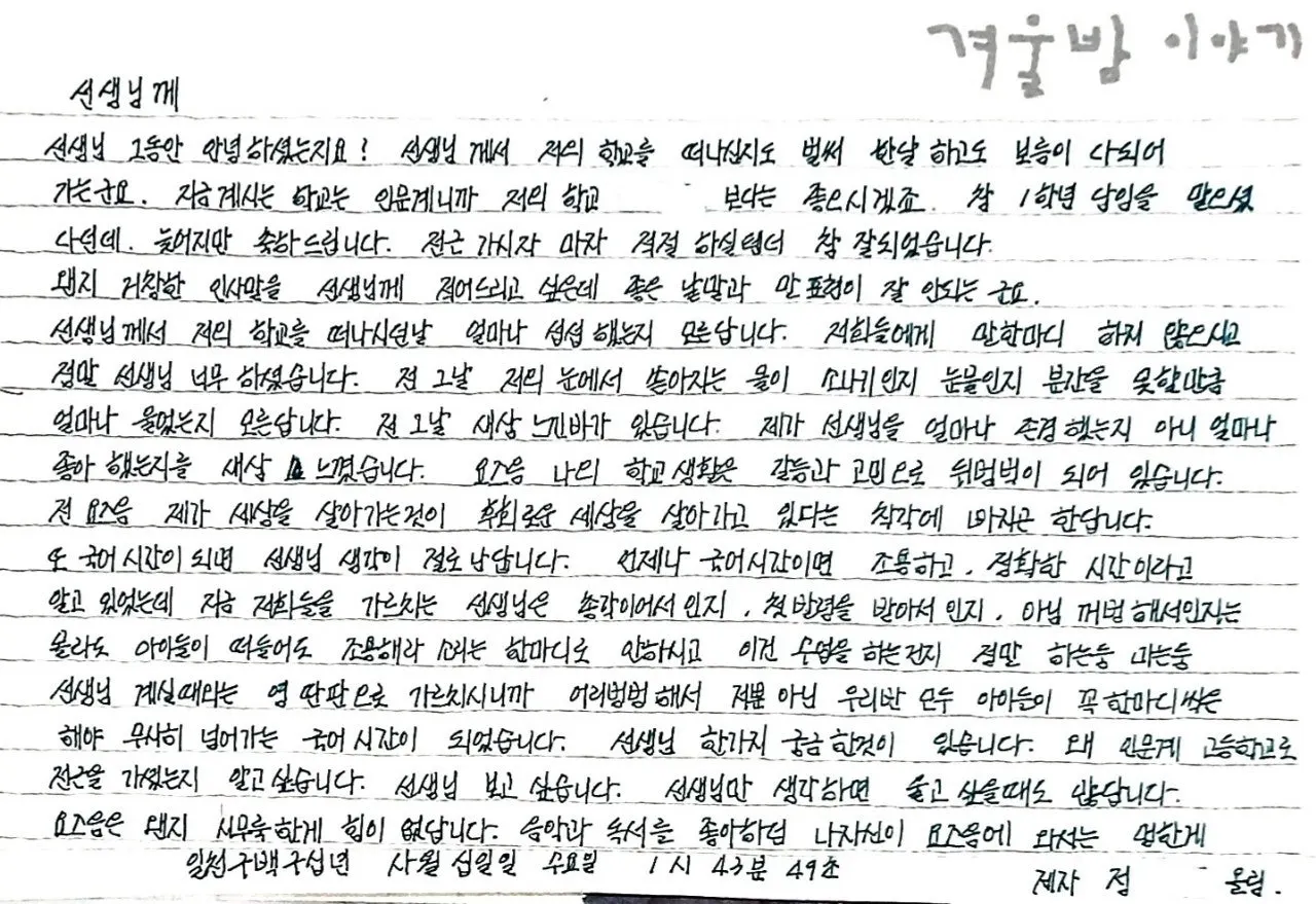 제가 언제나 방학을 앞두고 아이들에게 과제를 내줬지요. 담임선생님이나 다른 선생님께 꼭 편지 한 장 쓰라고. 정 보낼 선생님 안 계실 때면 나에게 편지 하라고. 다행히(?) 제게 편지가 많이 와 추억을 간직할 수 있게 되었습니다.