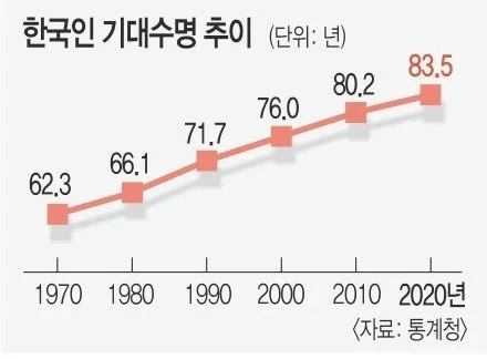 또래 다른 사람보다 많은지 적은지 알 수 없지만 처음 본 심정은 ‘생각보다 오래 살구나!’였다. 왜냐면 이런저런 병이 몸에서 떠나가지 않기에. 기대수명은 현재의 건강 상태로 보아 교통사고 같은 불의의 사고나 갑작스럽게 찾아온 중병으로 죽지 않을 때 살 수 있는 나이라 한다.
