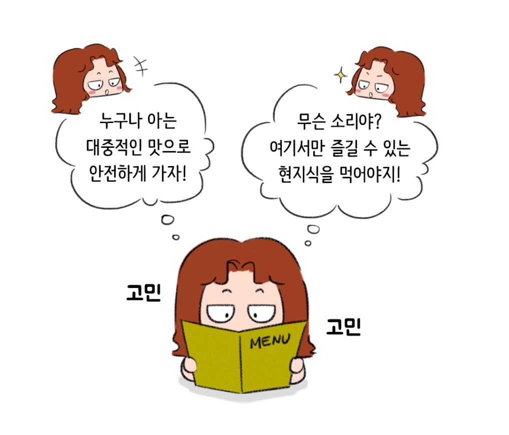 *. 첫 그림은 빈센트 반 고흐의 [한 켤레 낡은 구두]인데 익숙함의 의미를 잘 보여주며, 둘째 툰은 여행 중 익숙한 한식만 찾는 사람과 현지식 먹어야 한다는 내용으로 '대한항공 뉴스룸(2022년 06.20)'에서 퍼왔습니다.