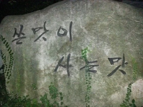자료사진에서 보이는 ‘쓴맛이 사는 맛’이란 글귀는 경남 양산시 효암고교 안 큰 돌에 새겨져 있는 글입니다. 허니까 시인은 이 학교에 들렀을 터. 다만 이 글의 내력을 알고 썼는지, 단지 '쓴맛이 사는 맛’이란 그 글귀에 끌려 썼는지 분명하진 않습니다.