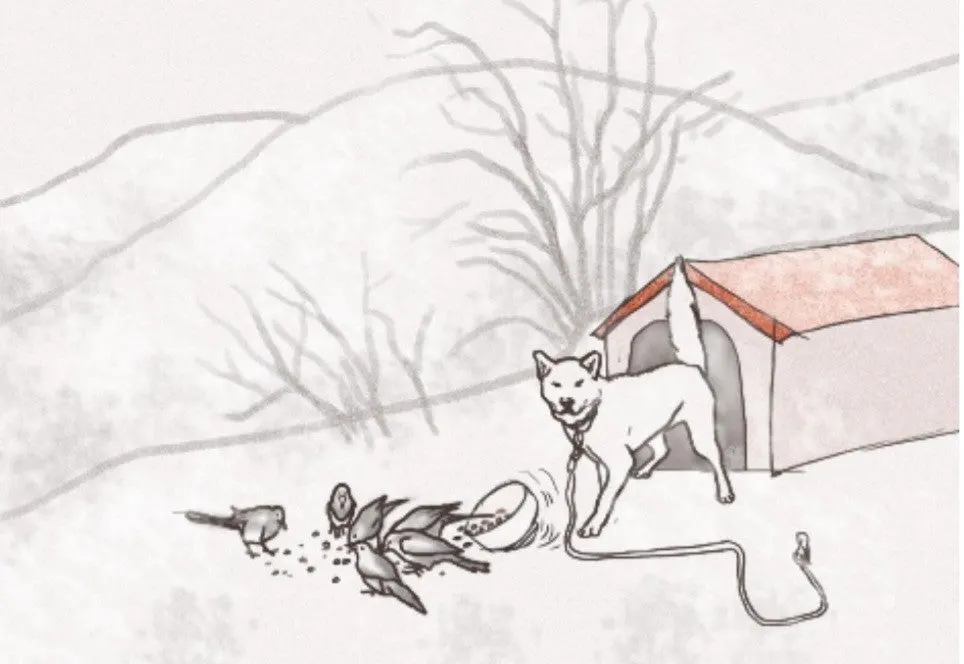 잠시 사방을 둘러봤습니다. 모든 게 눈으로 덮여 땅에 뭐가 있는지 하나도 보이지 않습니다. 그제사 제가 갖고 온 개 사료 때문임을 깨달았습니다. 땅바닥이 보여야 먹이를 찾을 텐데 아무것도 보이지 않으니 먹을 게 없고. 그러던 차 내가 들고 온 태백이 사료가 눈에 띄었으니...