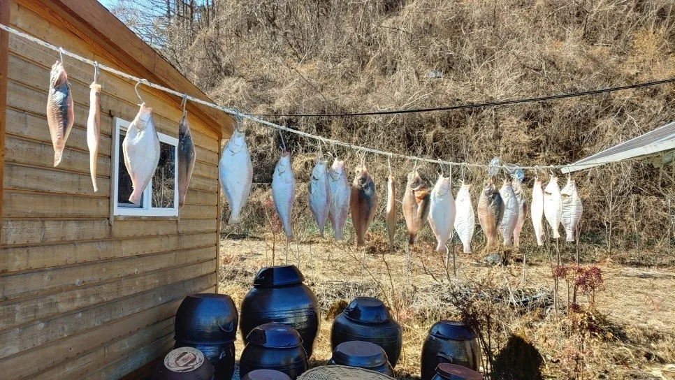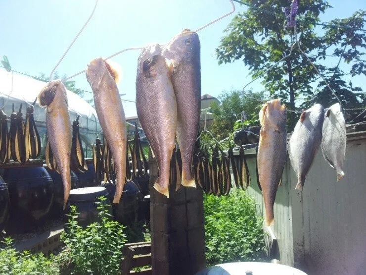 우리 집에도 오징어 사다가 피데기 만들거나 고등어, 조기, 민어 말리기 위해 빨랫줄에 망을 달아 넙니다. 그러면 고양이가 덤벼들 수 없지요. 헌데 화자가 깜박 조는 사이 우레와 소나기가 내려 마르기는커녕 오히려 흐믈흐믈해져 망쳐 버렸습니다.
