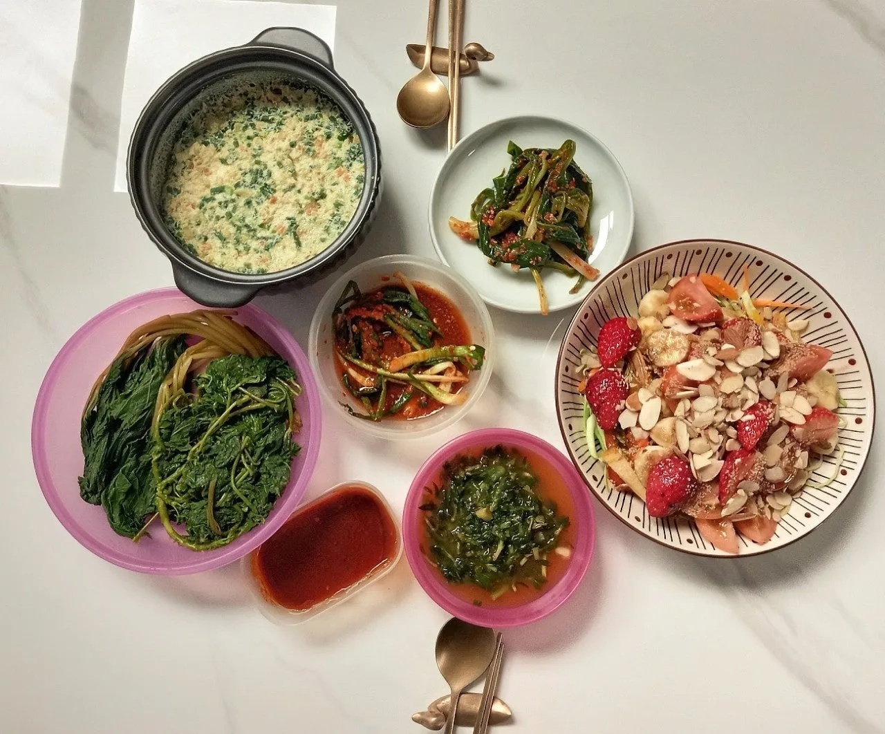 요즘 우리 집에 날마다 오르는 아침 밥상을 보자. (사진 참조) 둘 다 워낙 푸성귀를 좋아하다 보니 상 위는 달걀찜을 빼면 온통 '풀밭'이다. 머구잎과 엉개잎, 쪽파 김치, 돌냉이 물김치, 야채 과일을 버무린 샐러드, 그리고 비비추김치. (*. 머구 -> 머위, 엉개 -> 엄나무)